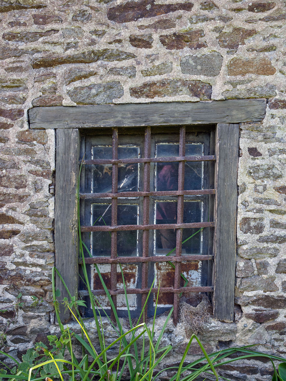Logis, façade nord, détail d'une ouverture à l'arrière : encadrement de bois et moellons locaux (2021)Immatriculation