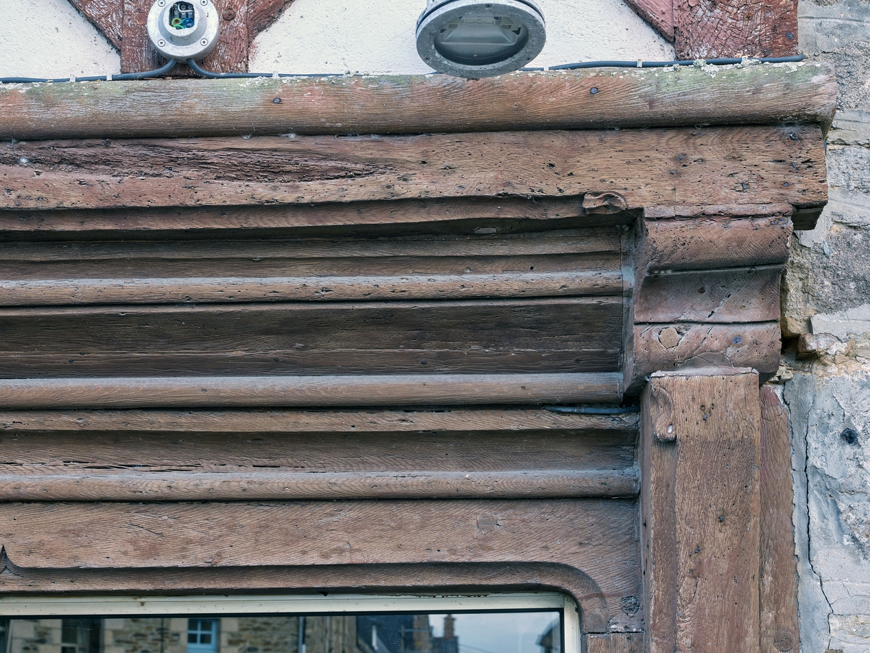 Détail du décor mouluré porté sur l'encorbellement. Une accolade est par ailleurs sculptée dans la sablière haute.Immatriculation