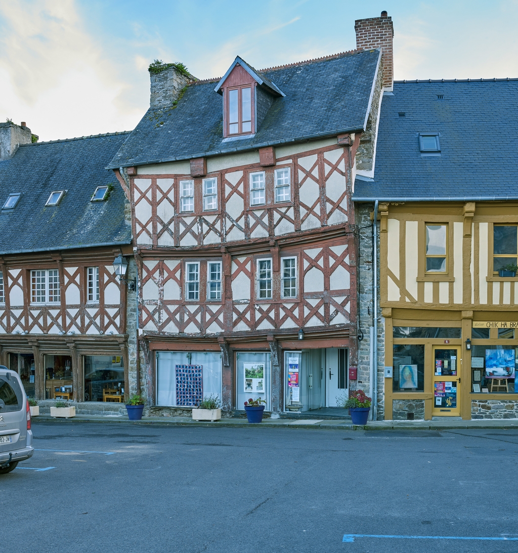 Alignement de maisons à façades en pan de bois.Immatriculation