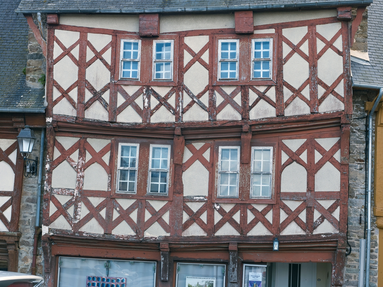 Façade en pan de bois en encorbellement au premier et second étage, éclairée par des baies en accolade.Immatriculation