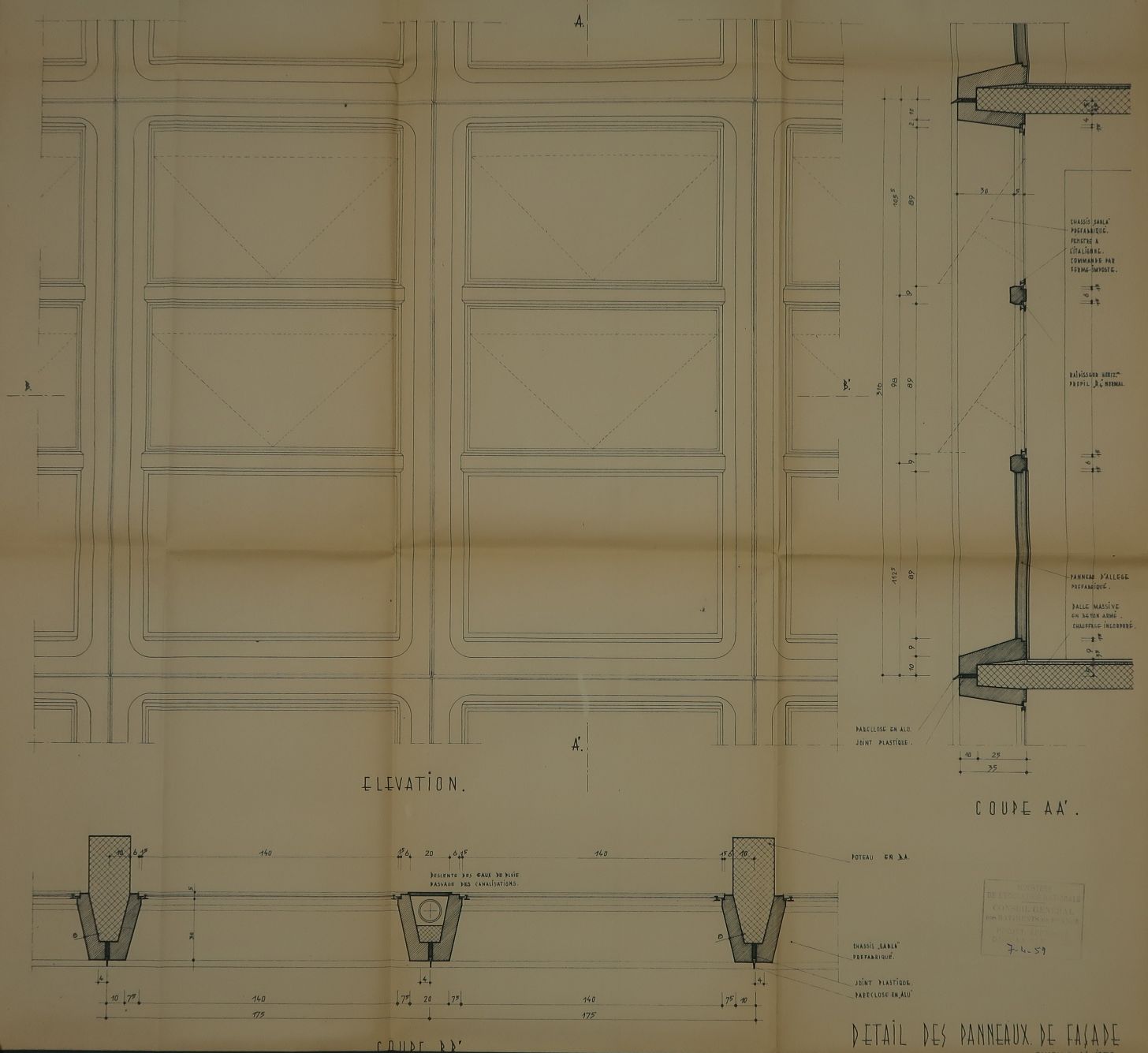 Détail des panneaux de façade. Le principe d'une façade rideau a été retenu. André Remondet et Patrice Simon, architectes, 23 janvier 1959.