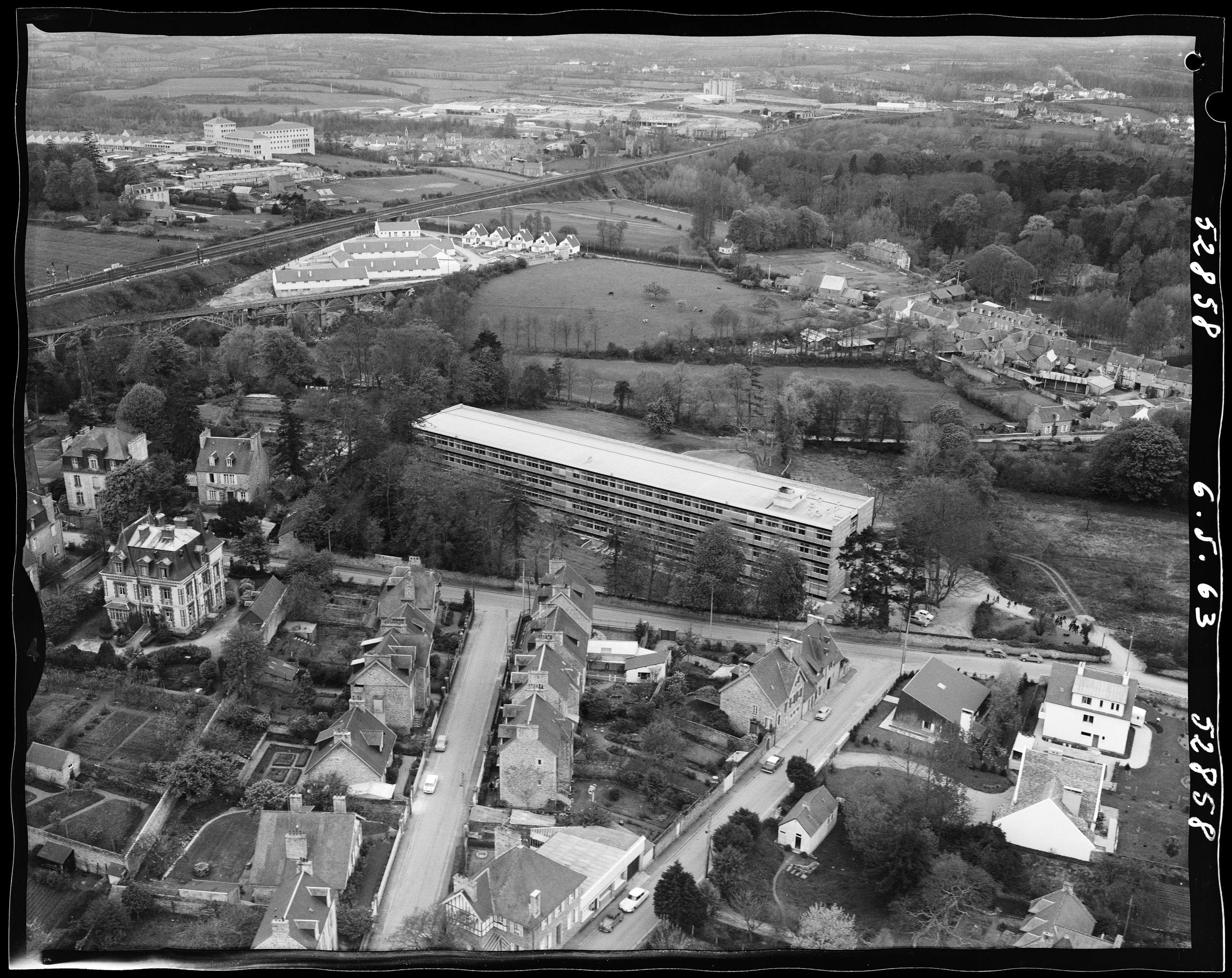 Vue aérienne de l'externat en 1963 (André Remondet et Patrice Simon, architectes). A l'arrière plan, on distingue l'école primaire publique de la Chesnaye et le Collège d'enseignement technique, actuel lycée professionnel jules Verne (Yves Moignet, architecte).Immatriculation