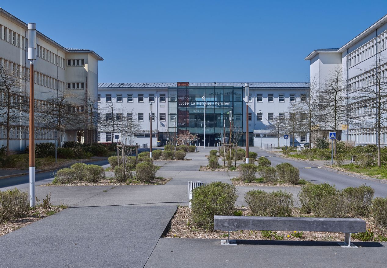 Vue d'ensemble partielle prise dans l'axe de la perspective est-ouest (de l'est vers l'ouest). De part et d'autre, les externats de l'ancien collège et du lycée Lesven (J-B. Mathon, architecte). Au second plan, le bâtiment A du lycée La Pérouse Kerichen (J-B. Mathon, architecte, restructuration 2004, par "Collectif Architectes").Immatriculation