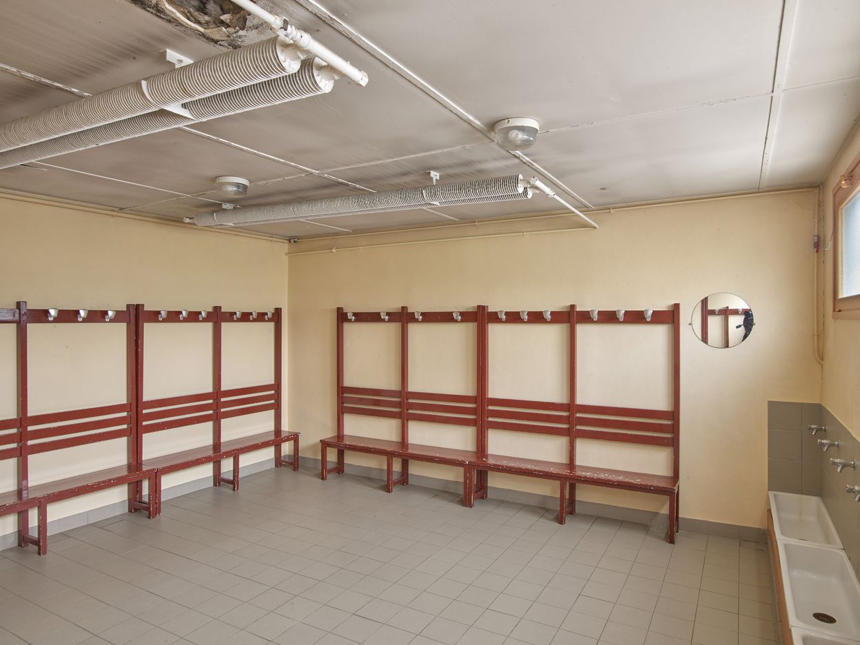 Vue intérieure d'un vestiaire, du mobilier et des radiateurs au plafond.Immatriculation