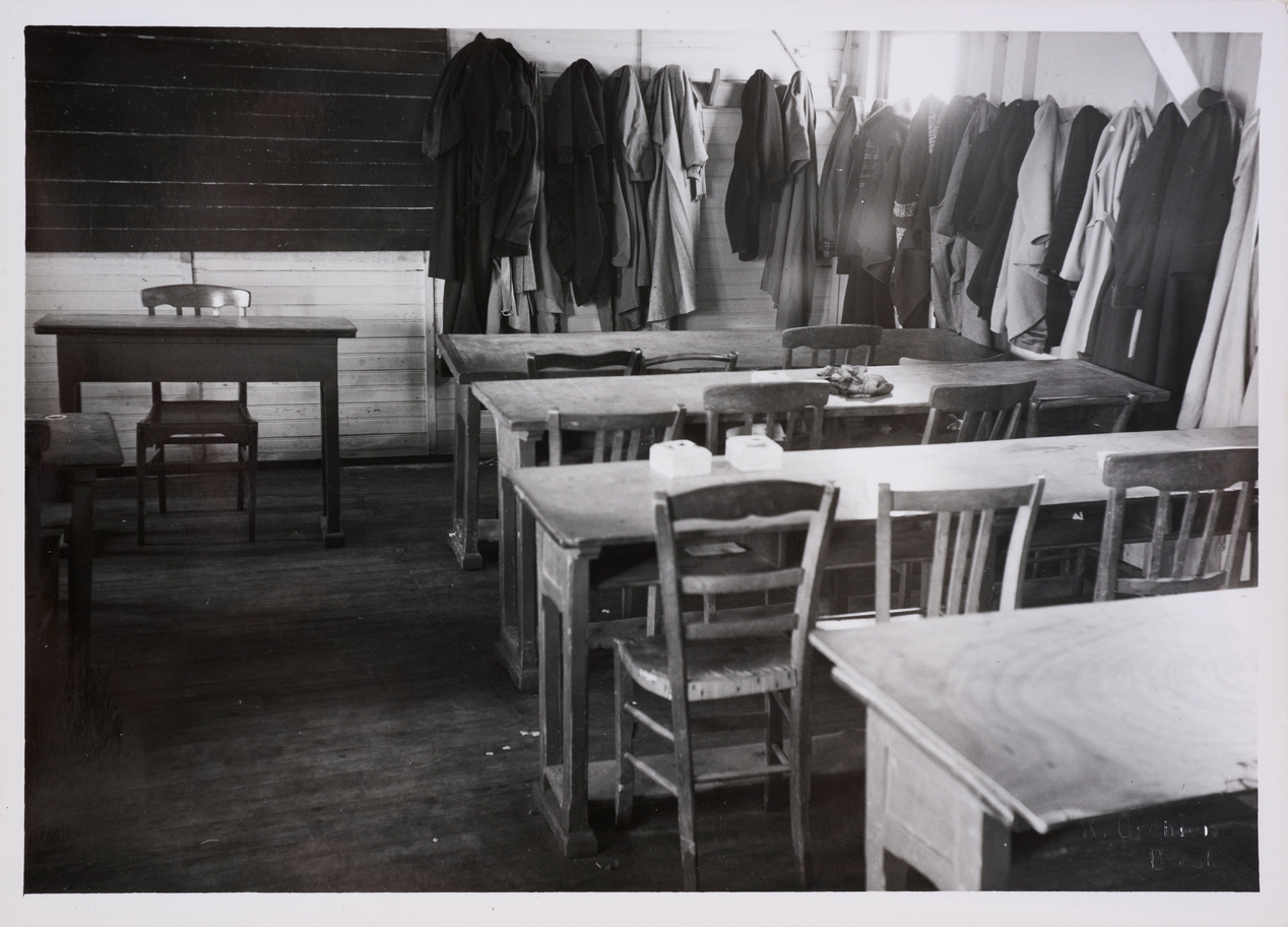 Collège technique en baraques. Une salle de classe. Noter les porte-manteaux, les chaises disparates, le tableau noir peint à même les planches du mur.Immatriculation