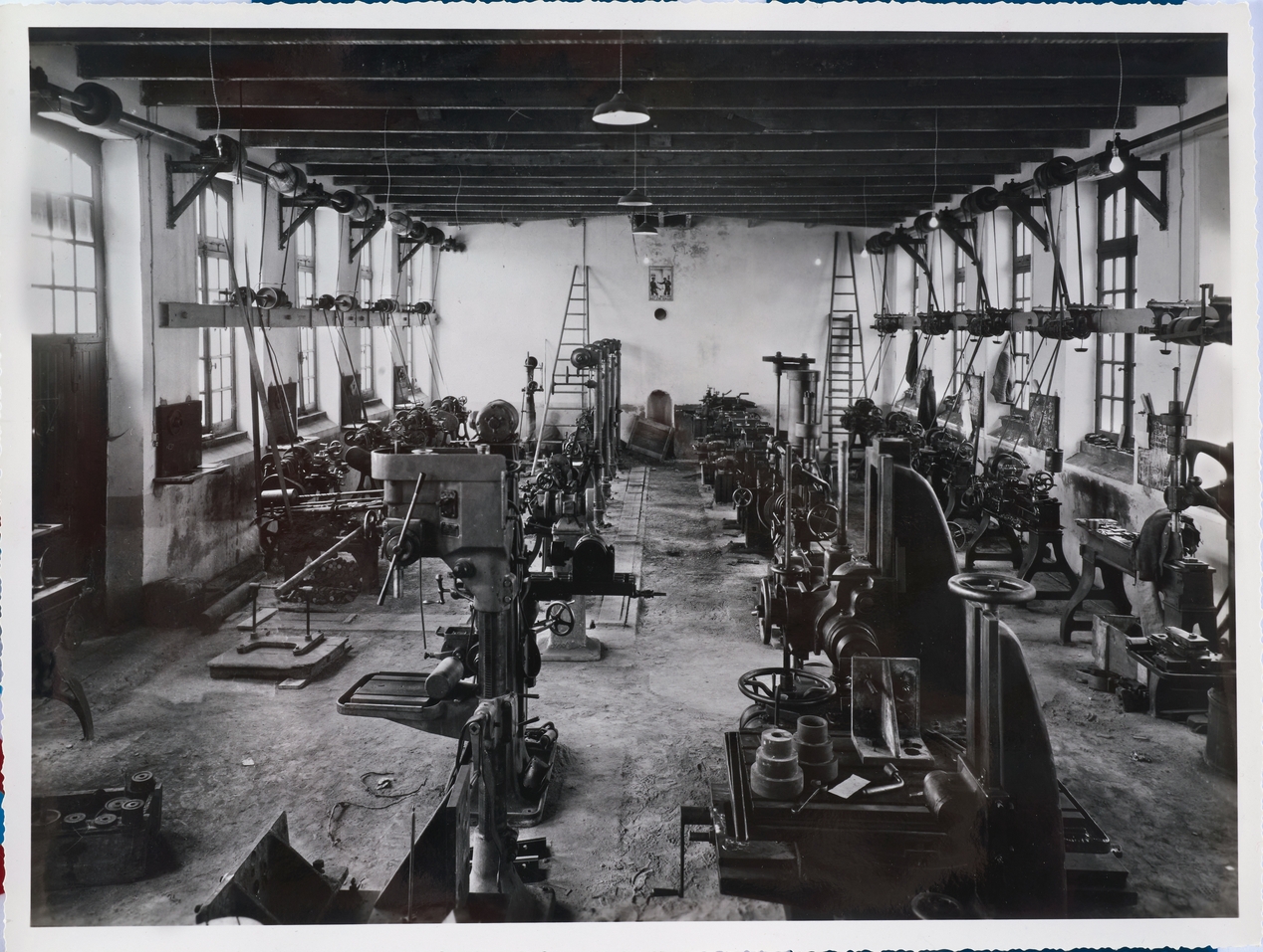 Collège technique en baraques. "Atelier des machines-outils. Rue Sébastopol. 45 à 58. M. Marchadour. M. Ollivier". (Entre guillemets, légende au dos de la photo). La mention "studio Le Bigot" au dos du tirage ne permet pas de dire s'il a pris le cliché ou l'a simplement développé.Immatriculation