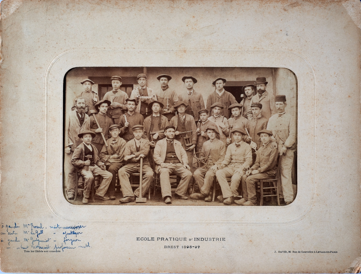Photo de classe. Ecole pratique d'industrie, 1896-97. Noter l'outillage.Immatriculation