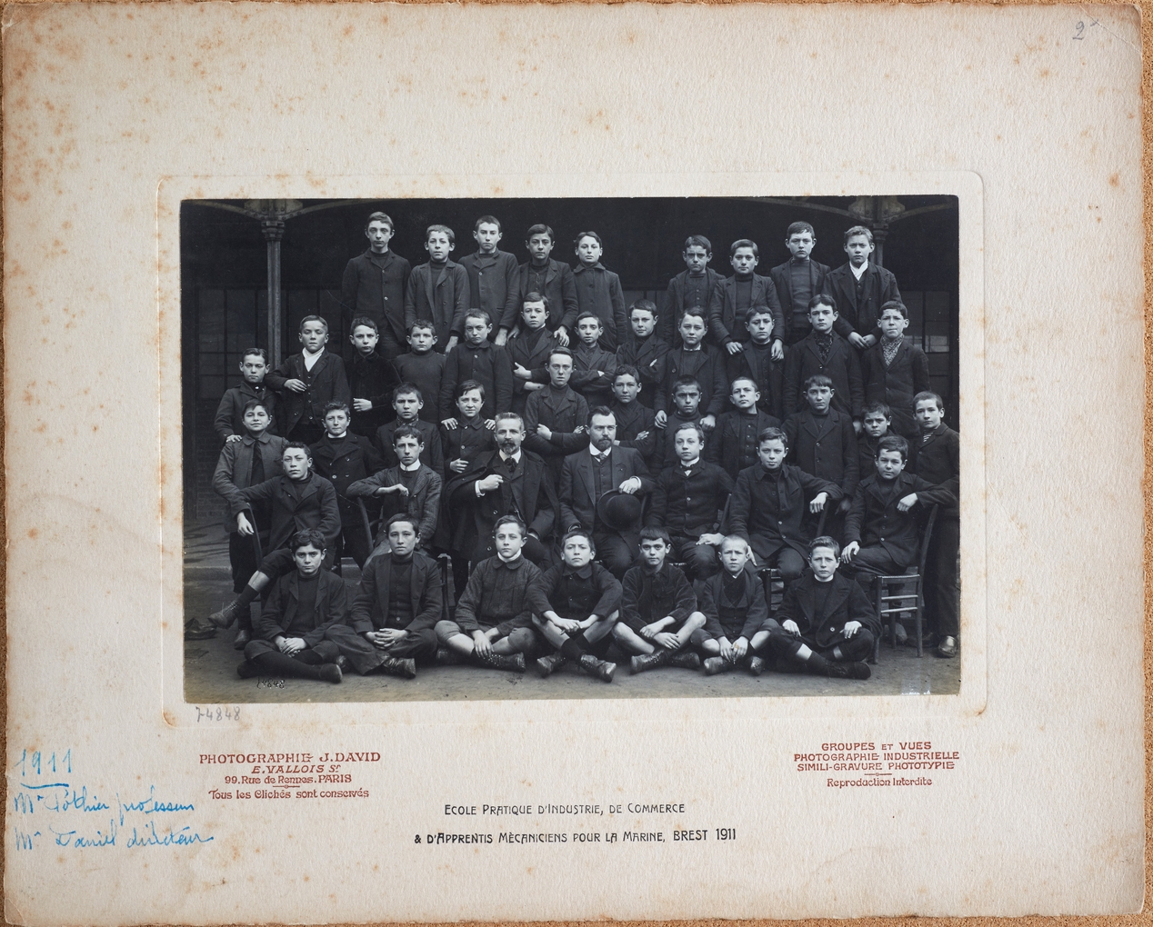 Photo de classe. Ecole pratique d'industrie, de commerce et d'apprentis mécaniciens pour la marine, Brest, 1911.Immatriculation