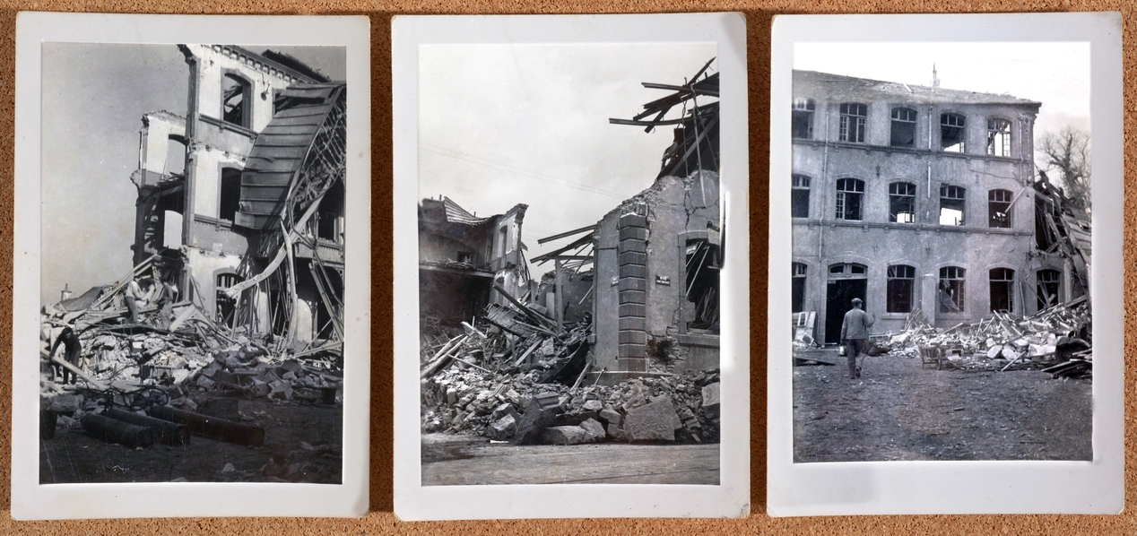 Bâtiment scolaire détruit par les bombardements de la Seconde Guerre mondiale à Brest, vraisemblablement ceux de l'école pratique d'industrie, rue Portzmoguer. Noter sur la photo de droite la galerie de circulation du 2e étage et sa structure métallique.Immatriculation