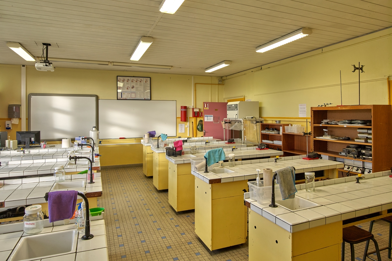 Salle de Chimie. Noter le mobilier (paillasses, tabourets) des années 1960, mais la sorbonne, le tableau blanc, l'ordinateur et le vidéoprojecteur contemporains.Immatriculation