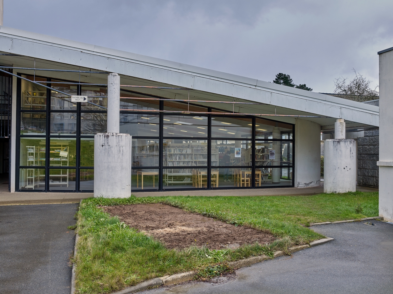 Façade ouest du CDI. Gildas Nédélec, architecte, 1994.Immatriculation
