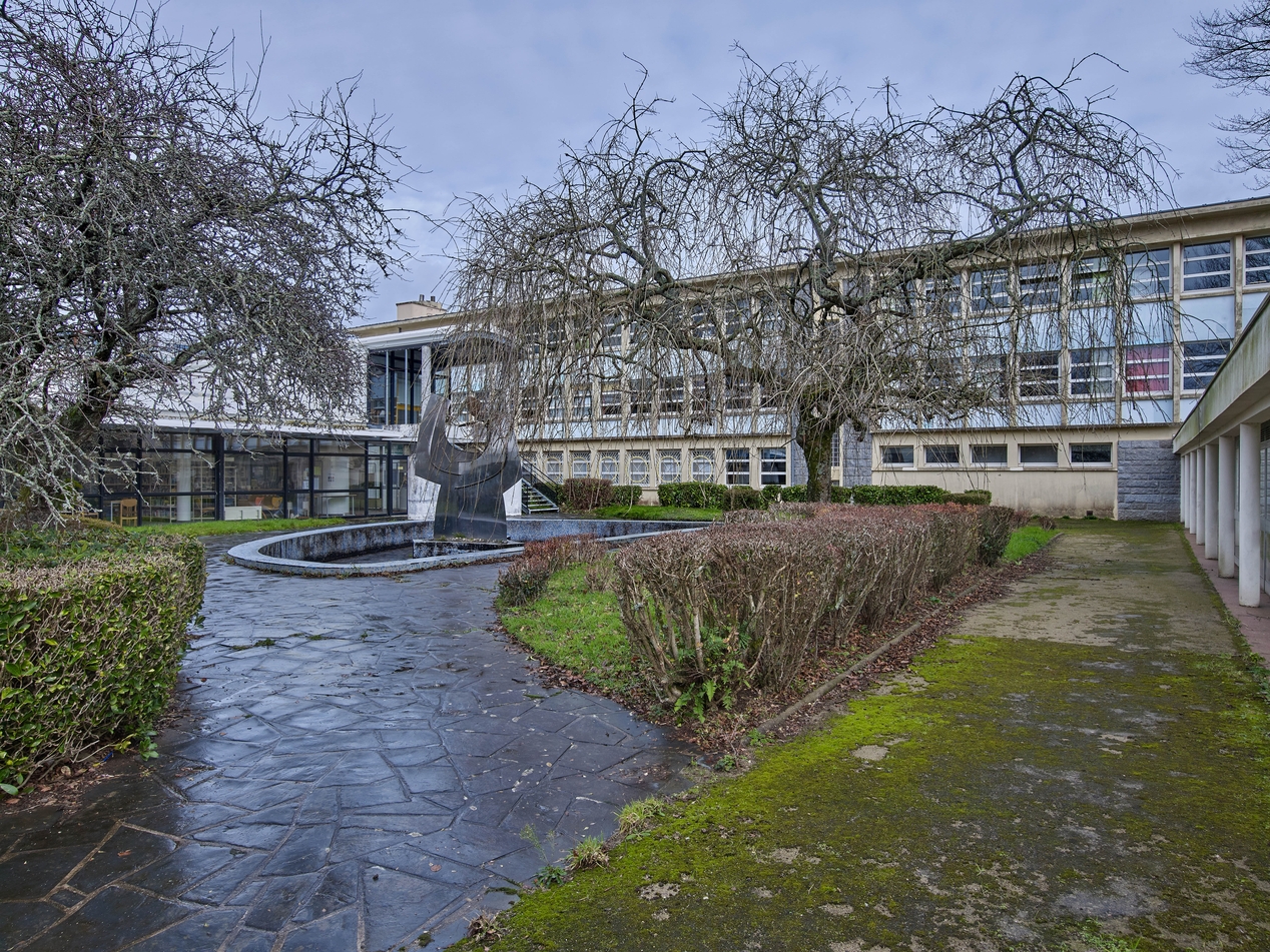 Vue d'ensemble du patio et de la sculpture de Philippe Hiquily (1973), prise du sud-ouest. Au nord, le CDI (Gildas Nédélec, architecte, 1994) ampute d'un tiers la surface du patio d'origine.Immatriculation