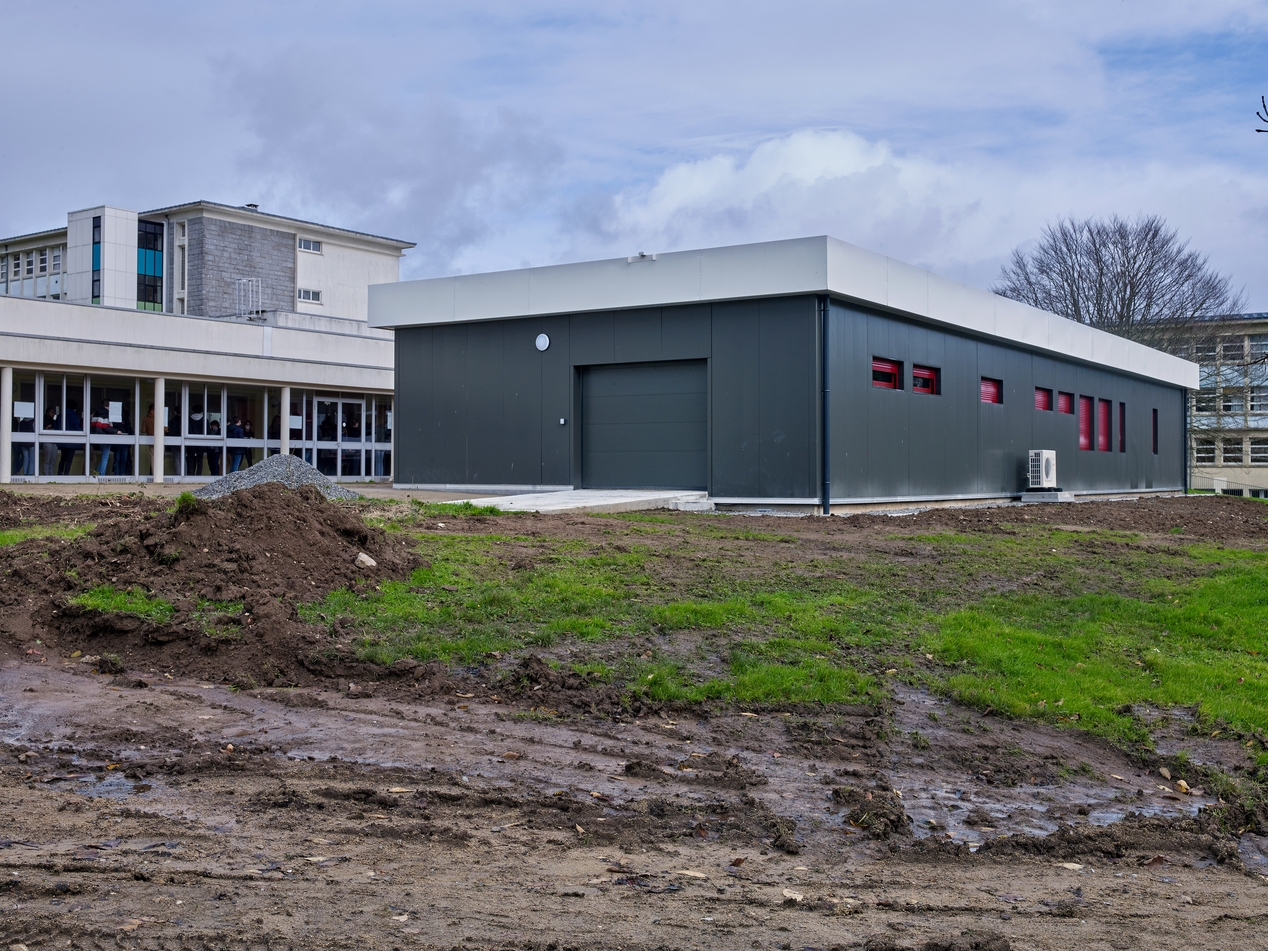 Ateliers des agents (2021) implantés au sud de la galerie de liaison entre le service de restauration et le collège.Immatriculation