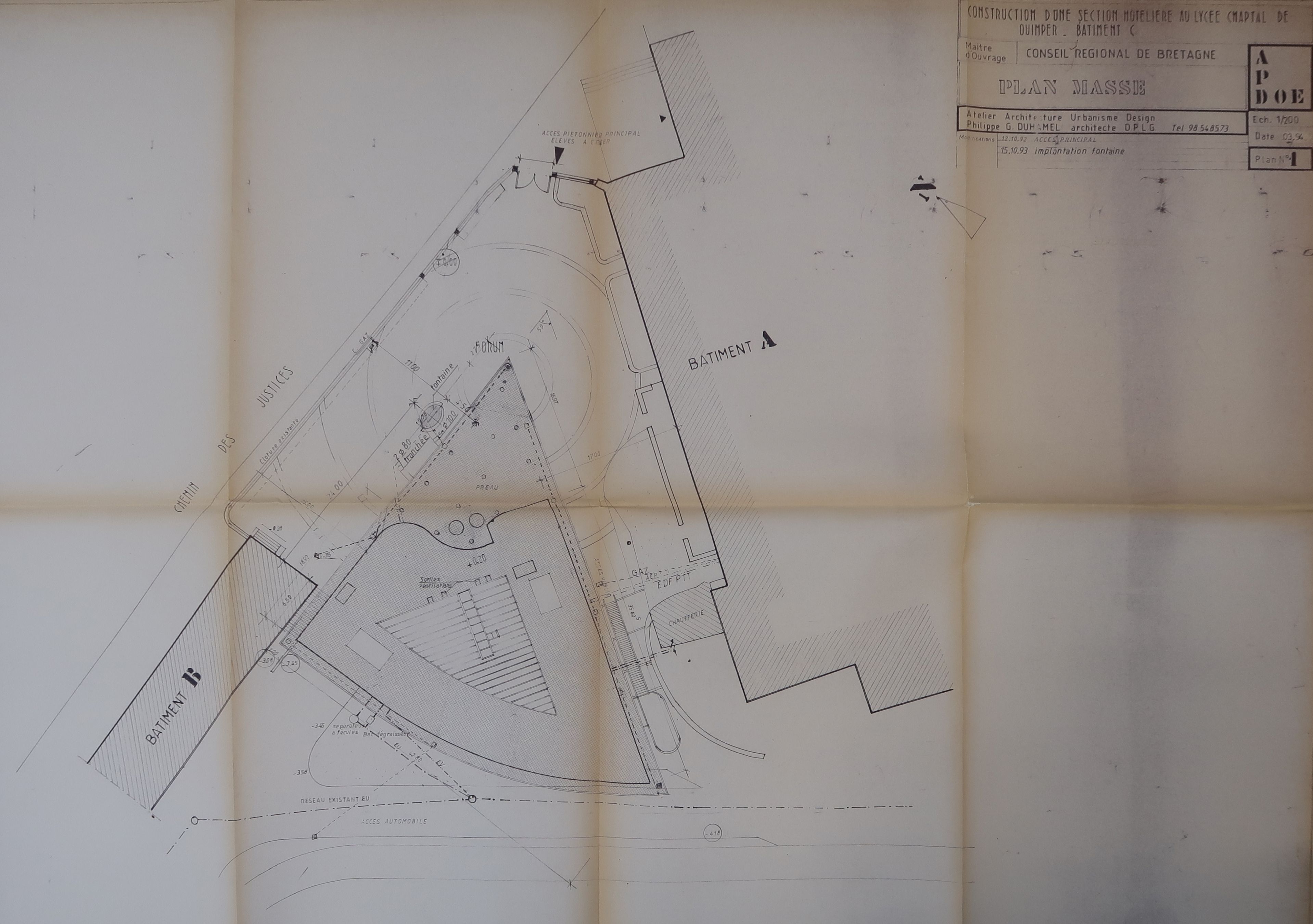 Implantation de la fontaine (projet non réalisé). Plan de masse, Philippe G. Duhamel, 15.10.93. La fontaine devait être implantée devant le préau.Immatriculation