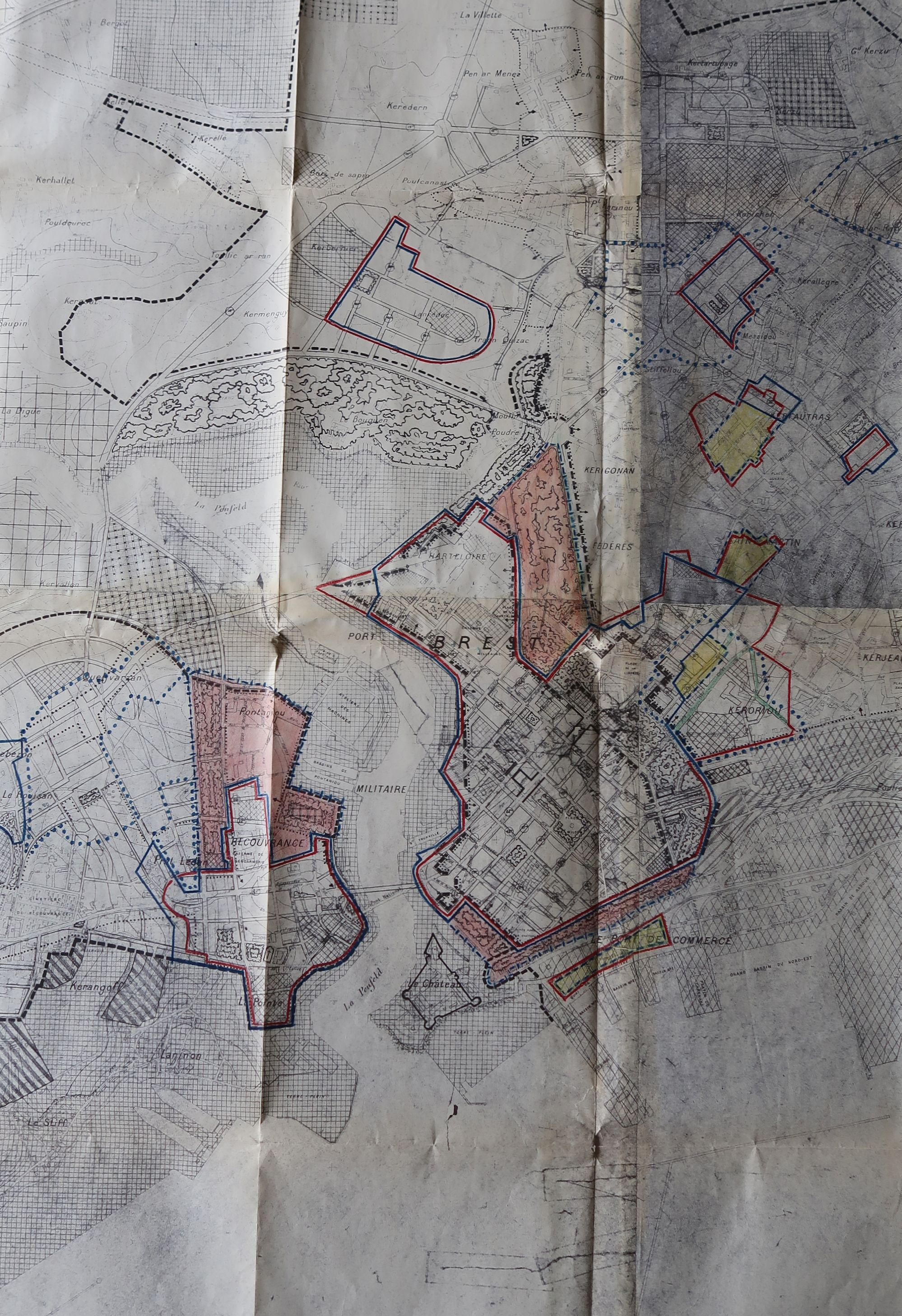 Plan d'aménagement et de reconstruction de Brest approuvé en 1948 (vue de détail). Au nord du centre-ville, au lieu dit Kerichen, les terrains de "réserve pour service public" dédiés à la cité scolaire.Immatriculation