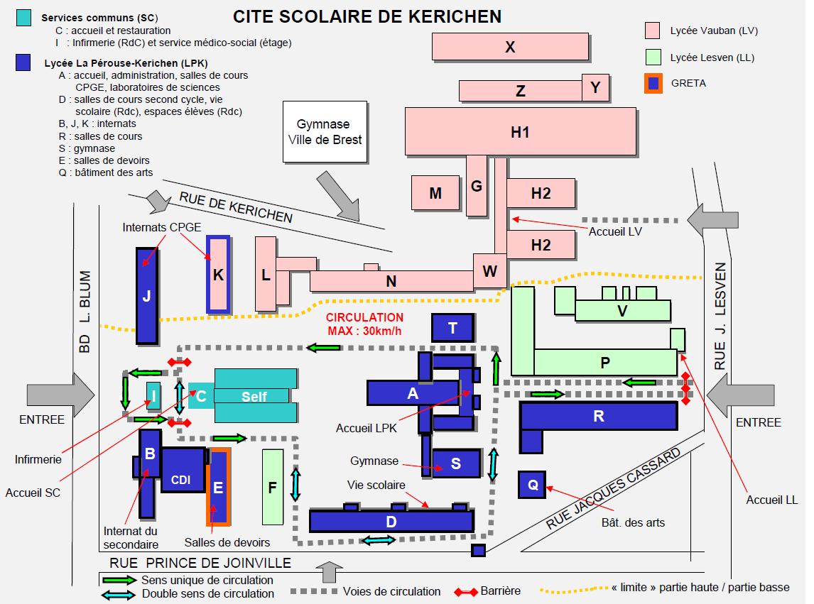 Plan de masse du lycée en 2020, avec les noms des bâtiments et leur affectation à chaque établissement : en rose, ceux du lycée Vauban.Immatriculation