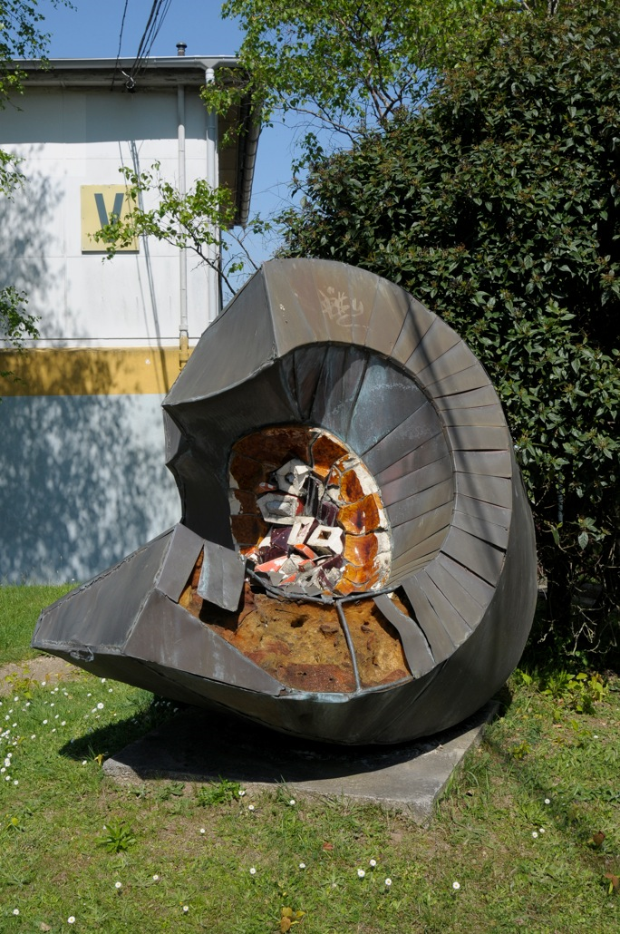 La géode, sculpture d'Yslav, le 18 avril 2011, avant sa disparition entre 2011 et 2019. On constate la présence de la haie mentionnée par l'artiste, qui empêchait de voir la sculpture depuis la rue. Photographie réalisée par Marc Rapilliard, pour le dictionnaire des lycées publics de Bretagne paru en 2012. Cette photo y est publiée, page 591, avec pour légende : "Le 1% à l'abandon, une situation banale, ici au lycée Jules Lesven de Brest".Immatriculation