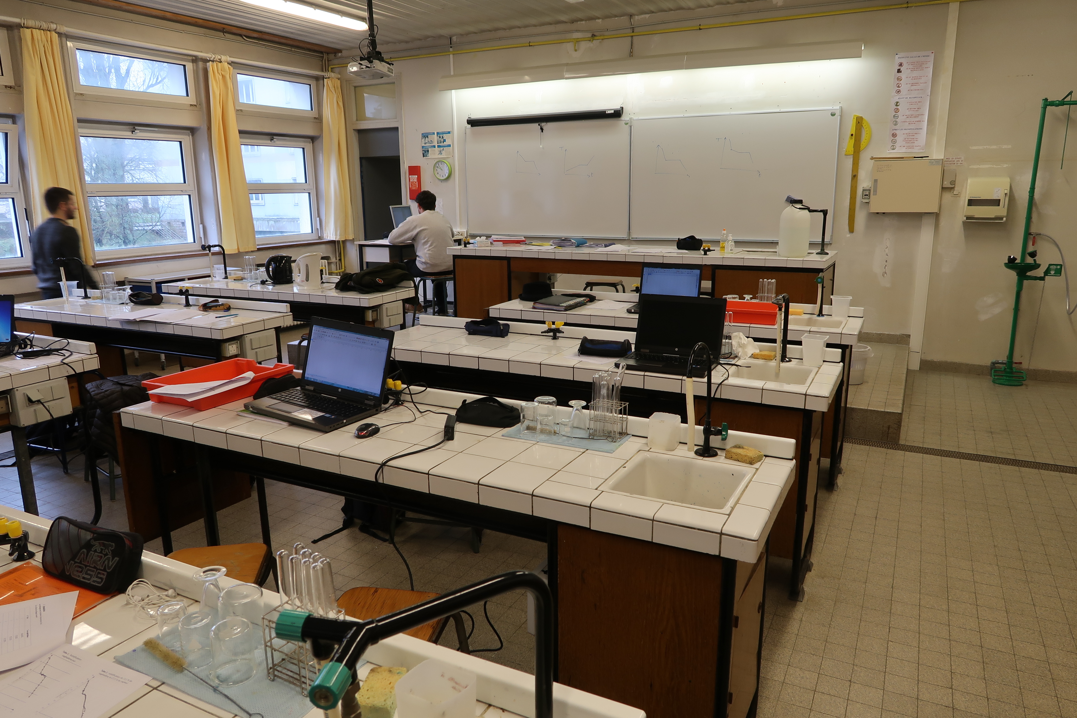 Salle de sciences avec estrade dans le bâtiment N (salle 127). En 2019, avant sa restructuration, elle était quasiment dans son état d'origine du début des années 1960.Immatriculation