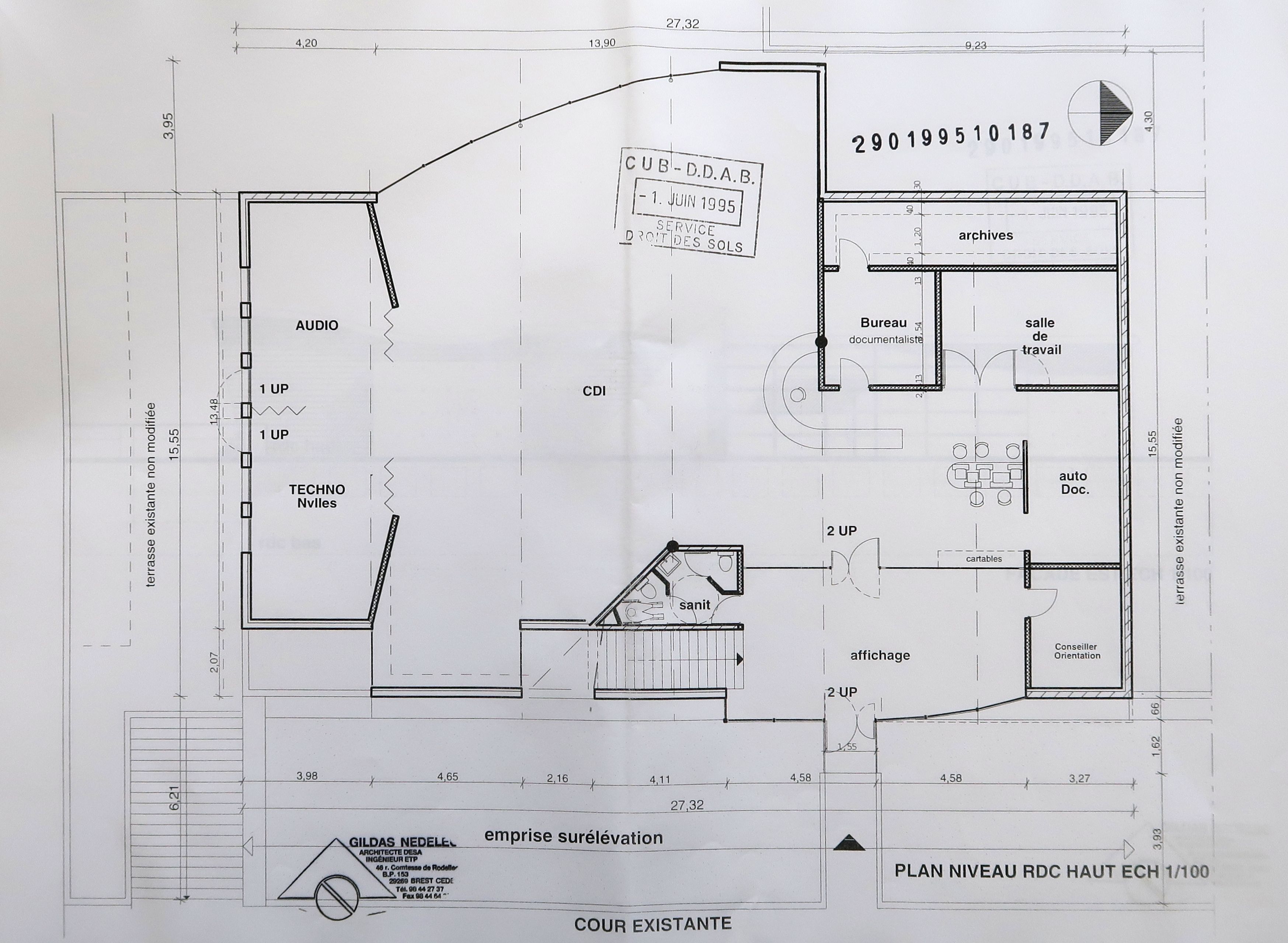 Centre de documentation et d'information : plan du rez-de-chaussée haut. Gildas Nédélec, architecte, 1er juin 1995.Immatriculation