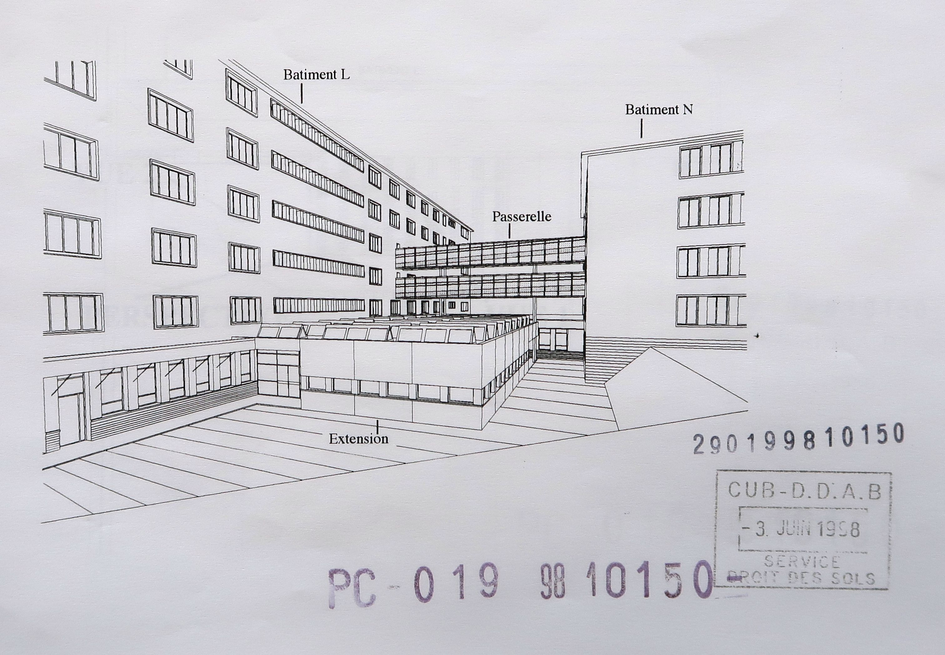 Extension ateliers dessin : vue perspective depuis le sud-est. Archipôle urbanisme et architecture, architectes, 1998. (atelier dessins)Immatriculation