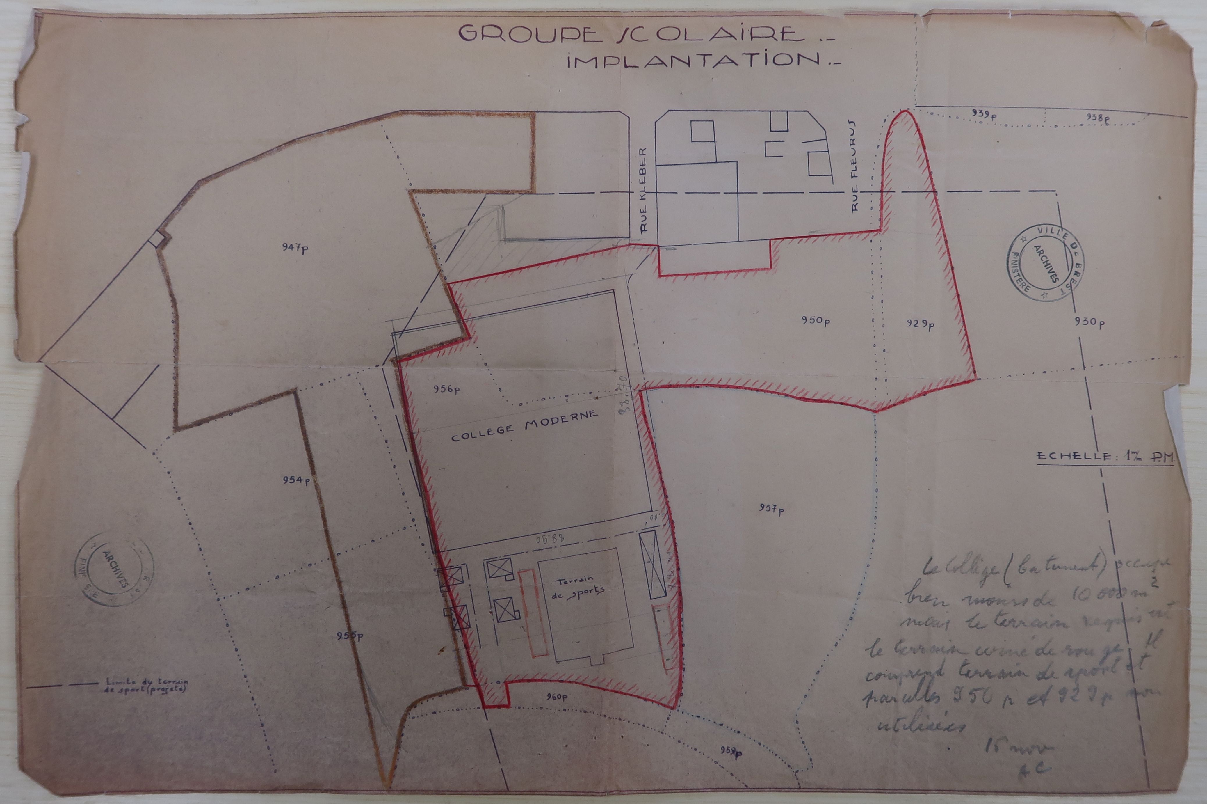 Plan du collège moderne en baraques. Groupe scolaire. Implantation. Le collège (bâtiment) occupe bien moins de10000 m2 mais le terrain requis est le terrain cerné de rouge. Il comprend le terrain de sport et parcelles 950 p et 929 p non utilisées".Immatriculation