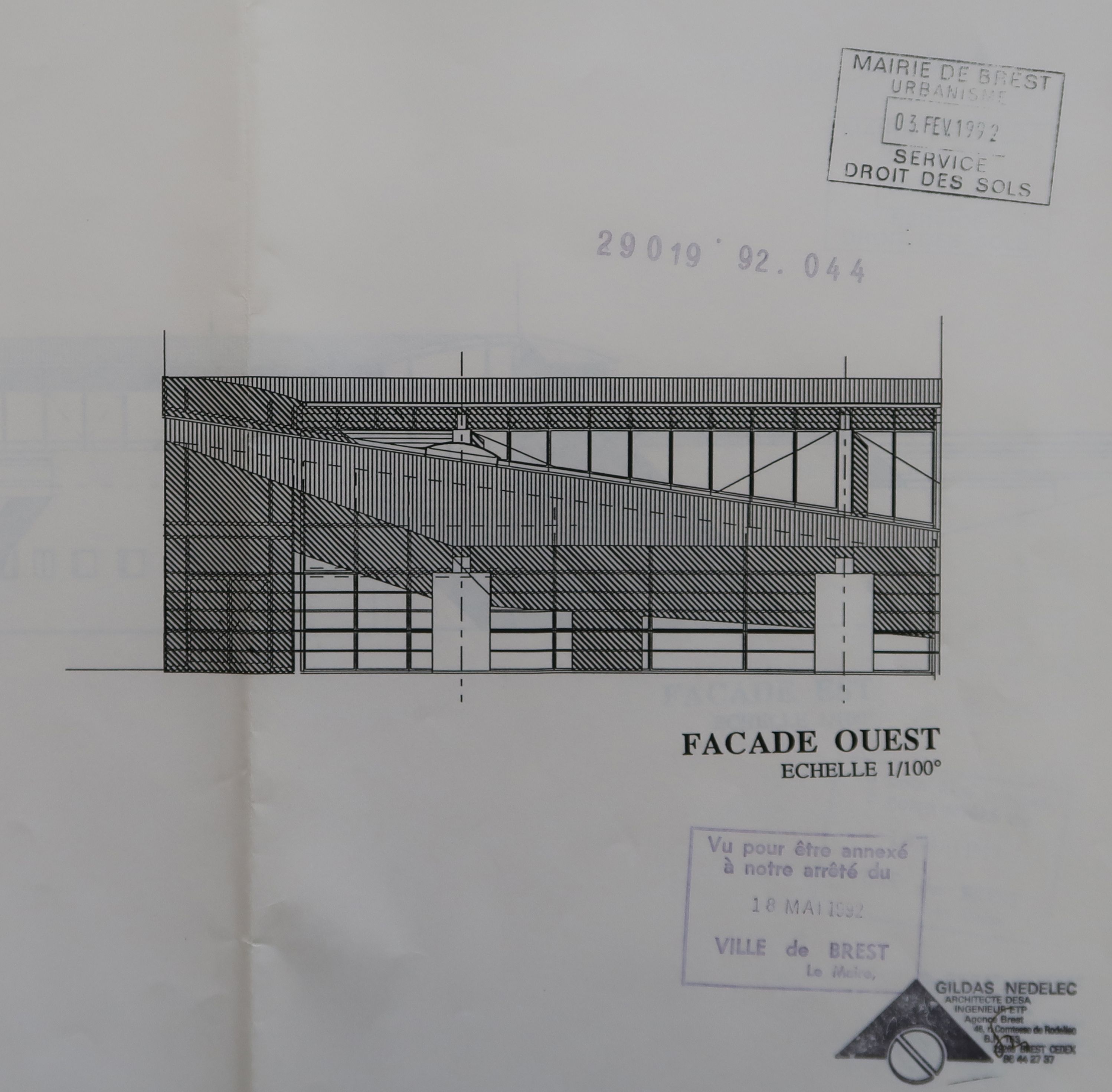 Elévation de la façade ouest du centre de documentation et d'information, Gildas Nédélec, architecte, 1992.Immatriculation