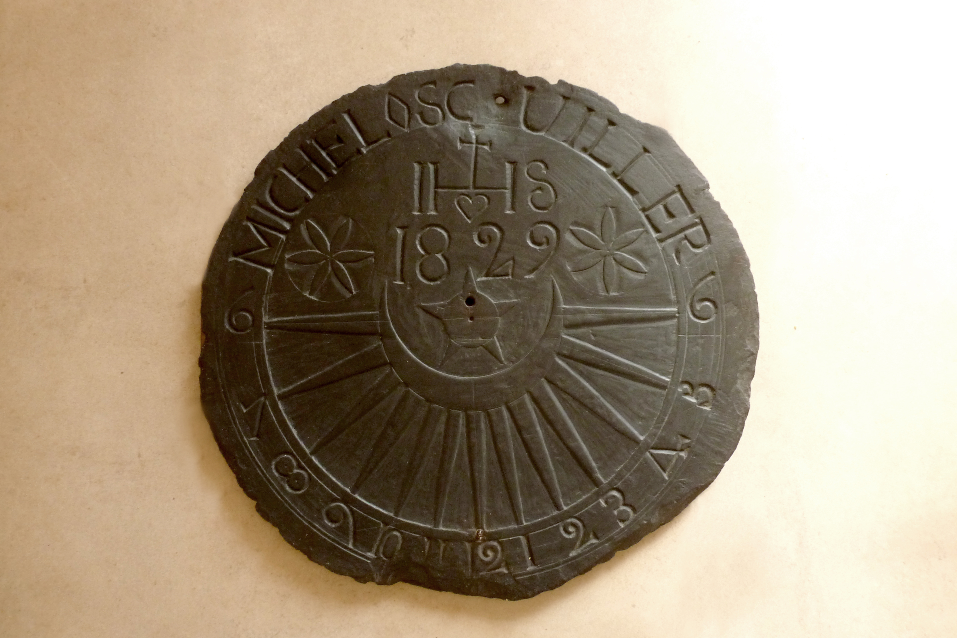 Confort-Meilars, ferme. Cadran solaire daté 1829 originairement placé sur la souche de cheminée ouest du logis. Inscription : MICHEL SCUILLER / IHS. (2020)Immatriculation