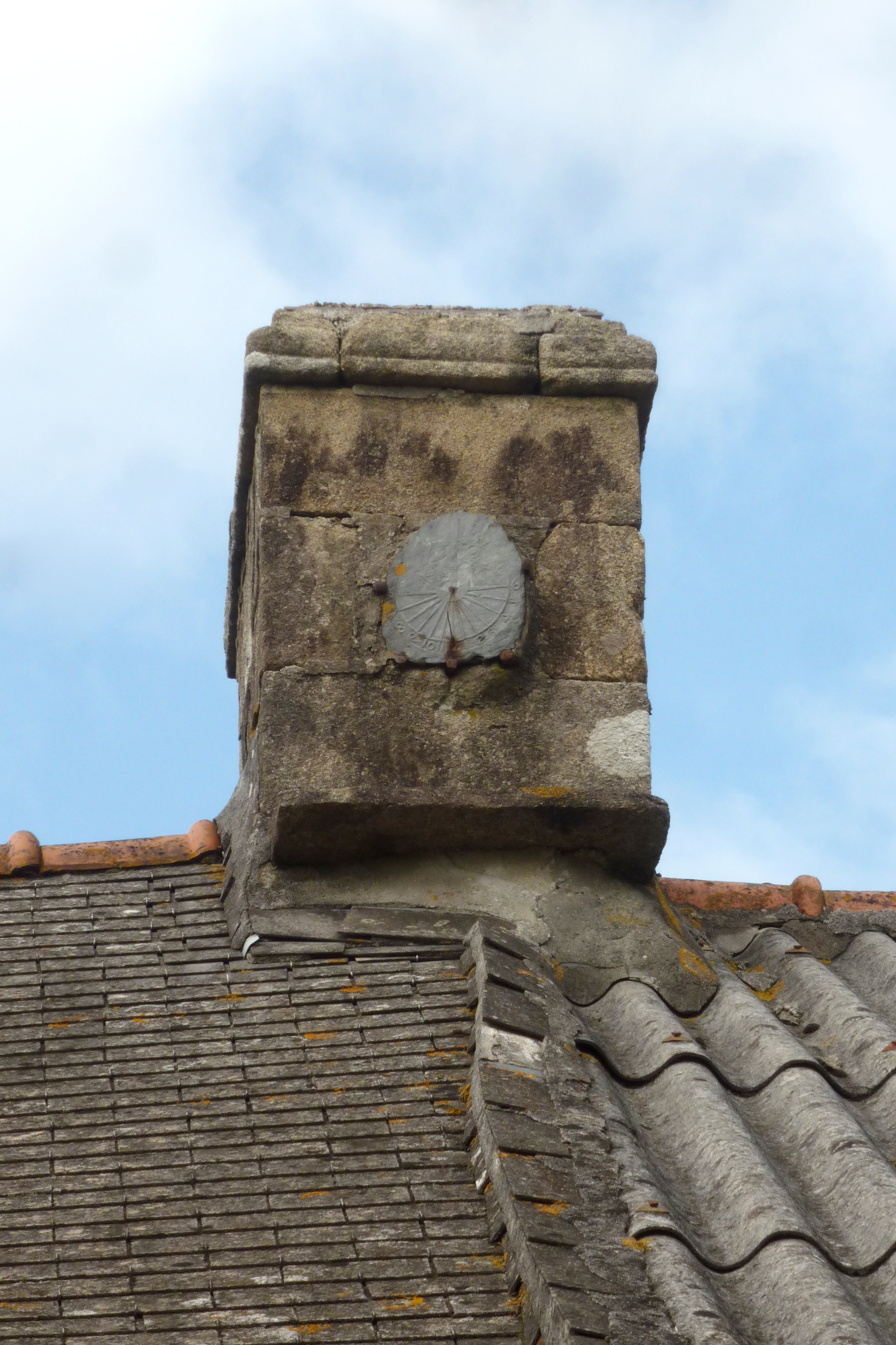Ferme est, détail de la souche de cheminée est. Cadran solaire.Immatriculation