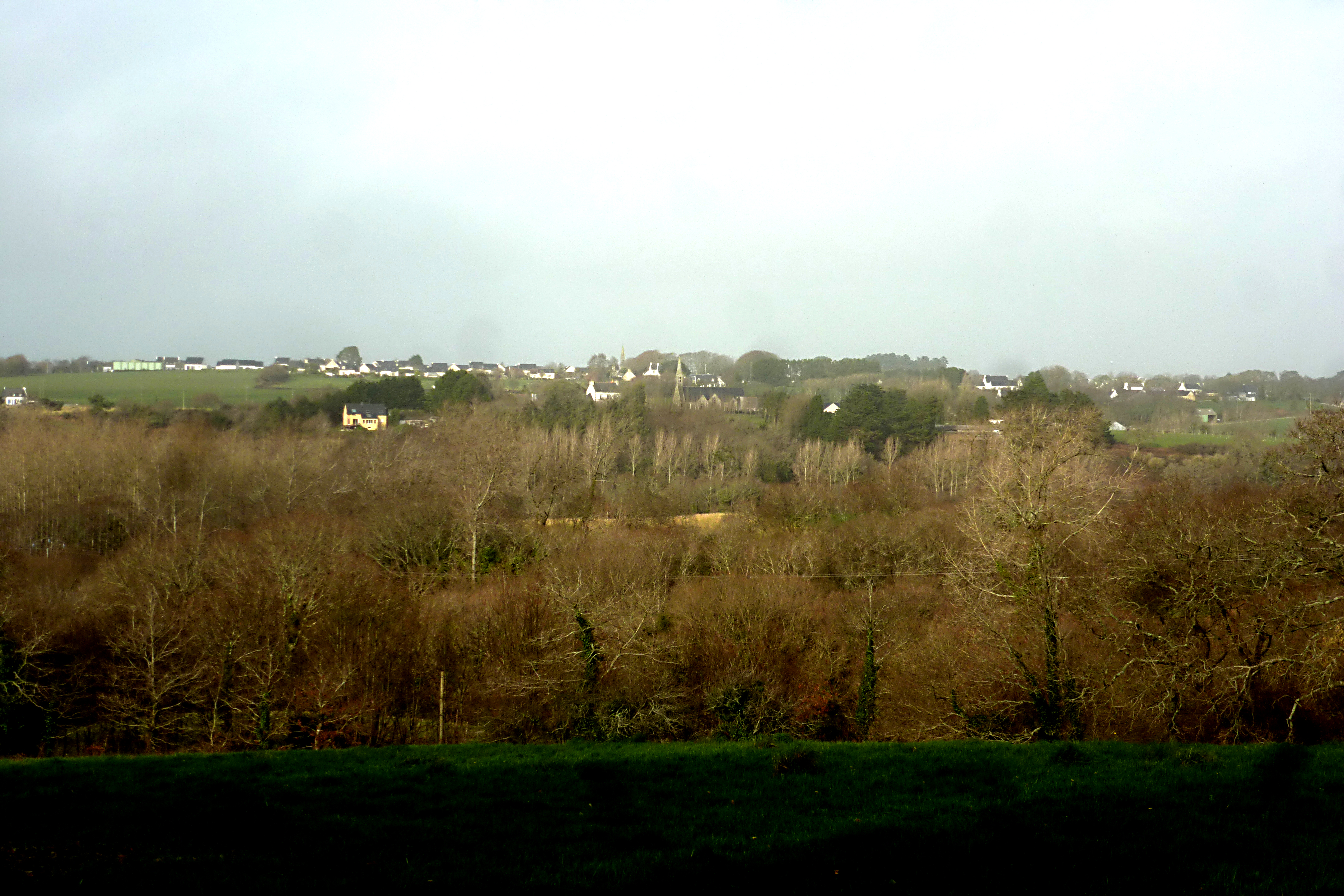 Vue prise de Mahalon. L'église dans son environnement. (2021)Immatriculation