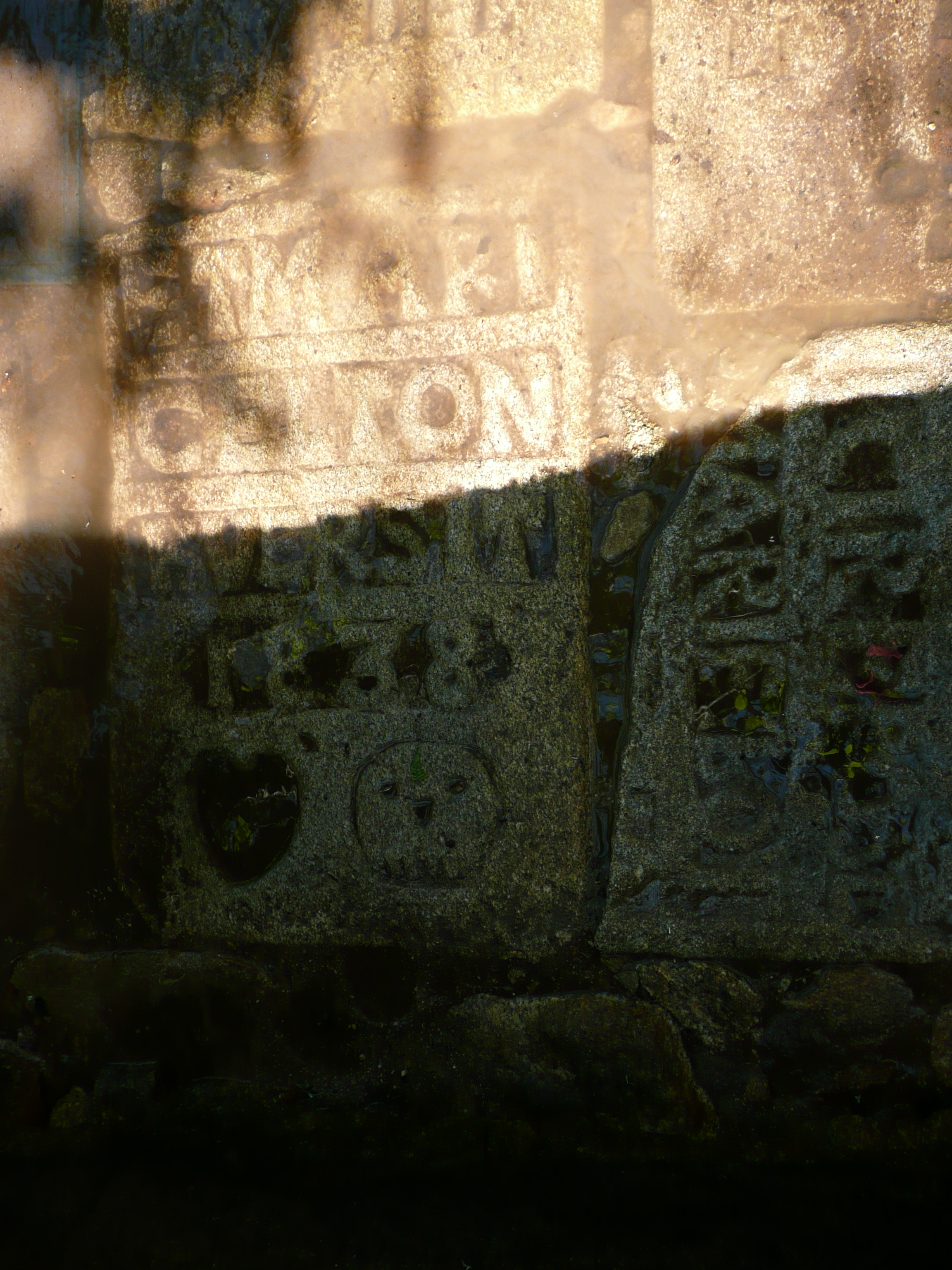 Détail dallage. Pierre tombale avec inscription : ETMARI/CELTON/K(er)VERSIT/1838. (2017)Immatriculation