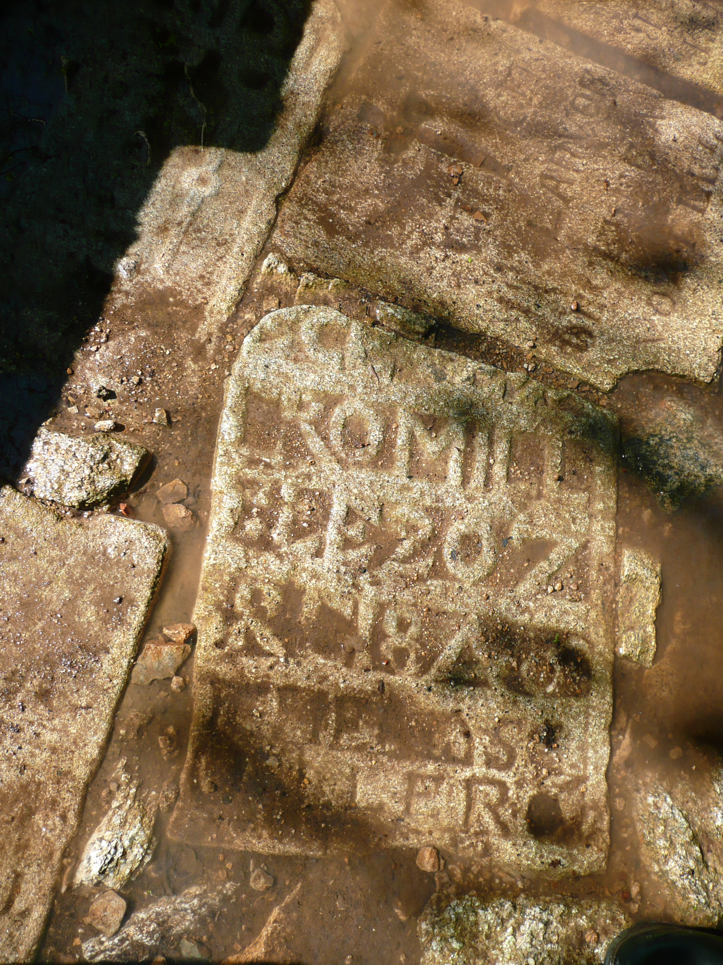 Détail dallage. Pierre tombale avec inscription : TROMILL(ou) / LE 20 7 / 1848 / (m)ICHEL SC / UILLER. (2017)Immatriculation