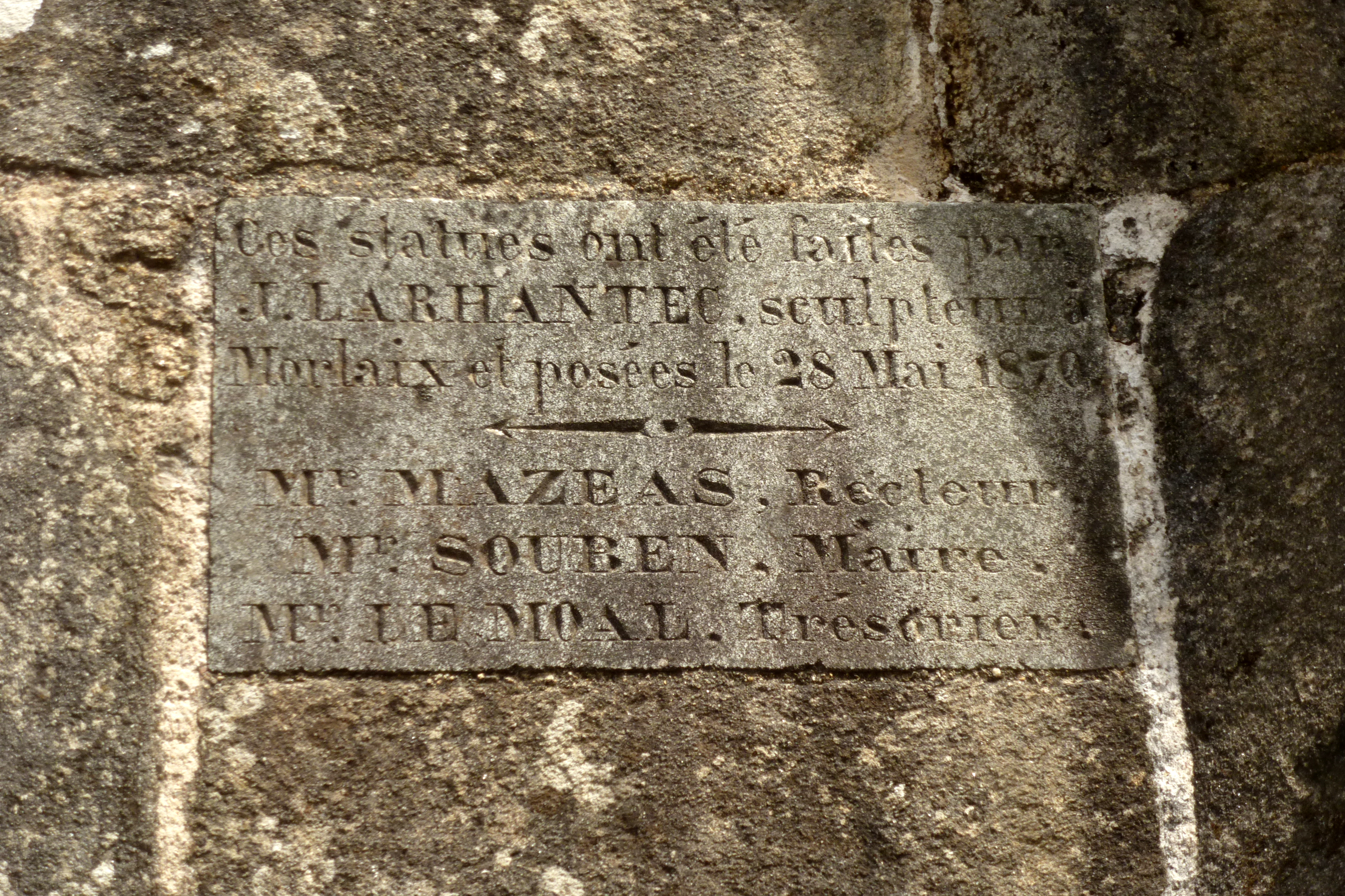 Socle, côté ouest. Inscription : Les statues ont été faites par Y LARHENTEC sculpteur à Morlaix et posées le 28 mai 1870 / MR MAZEAS Recteur MR SOUBEN Maire M. LE MOAL Trésorier. (2021)Immatriculation