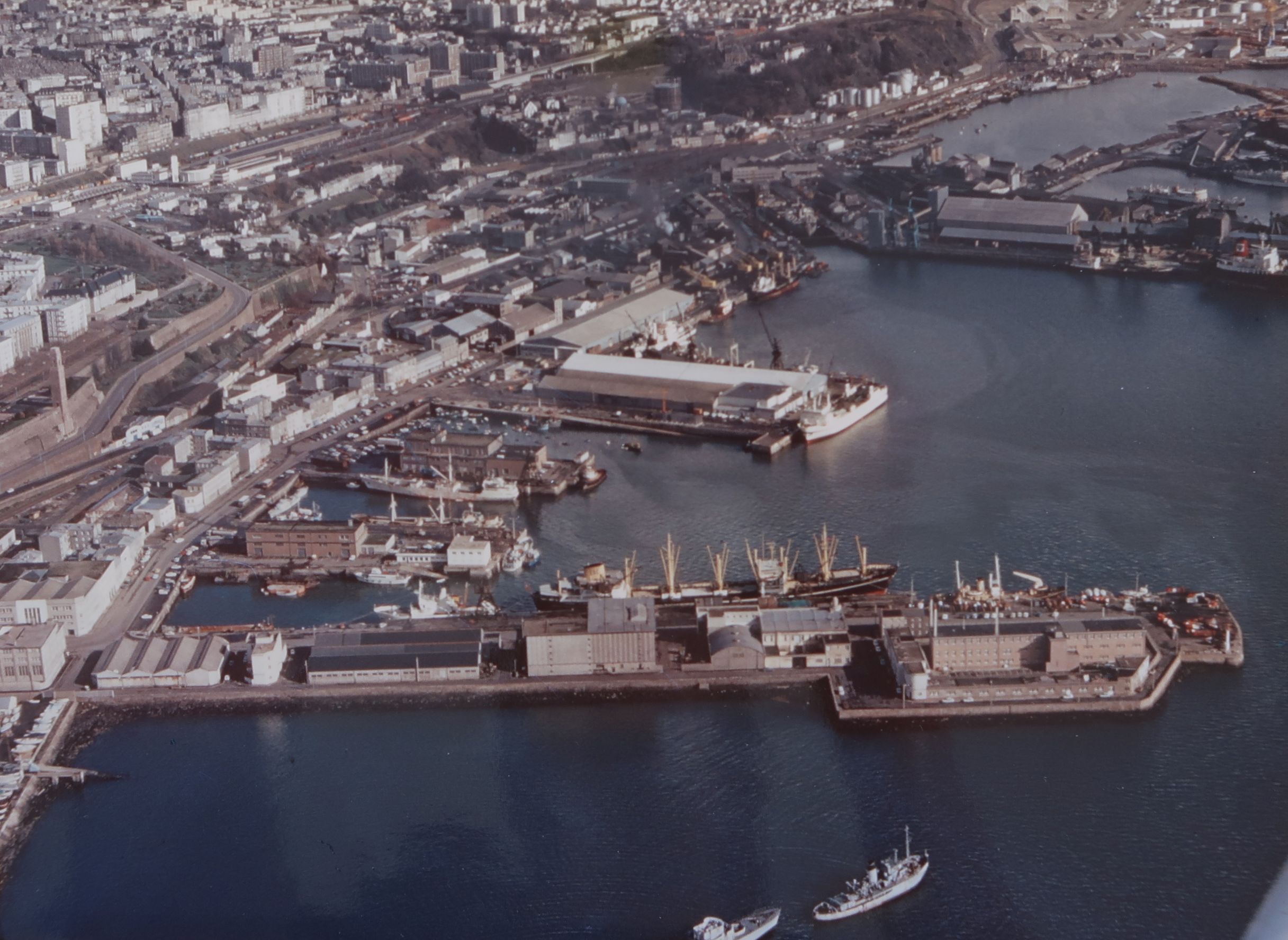 Vue aérienne du port de Brest en 1974 : jetée Ouest, bassins 1 à 5, jetée Est et anse de Saint-MarcImmatriculation