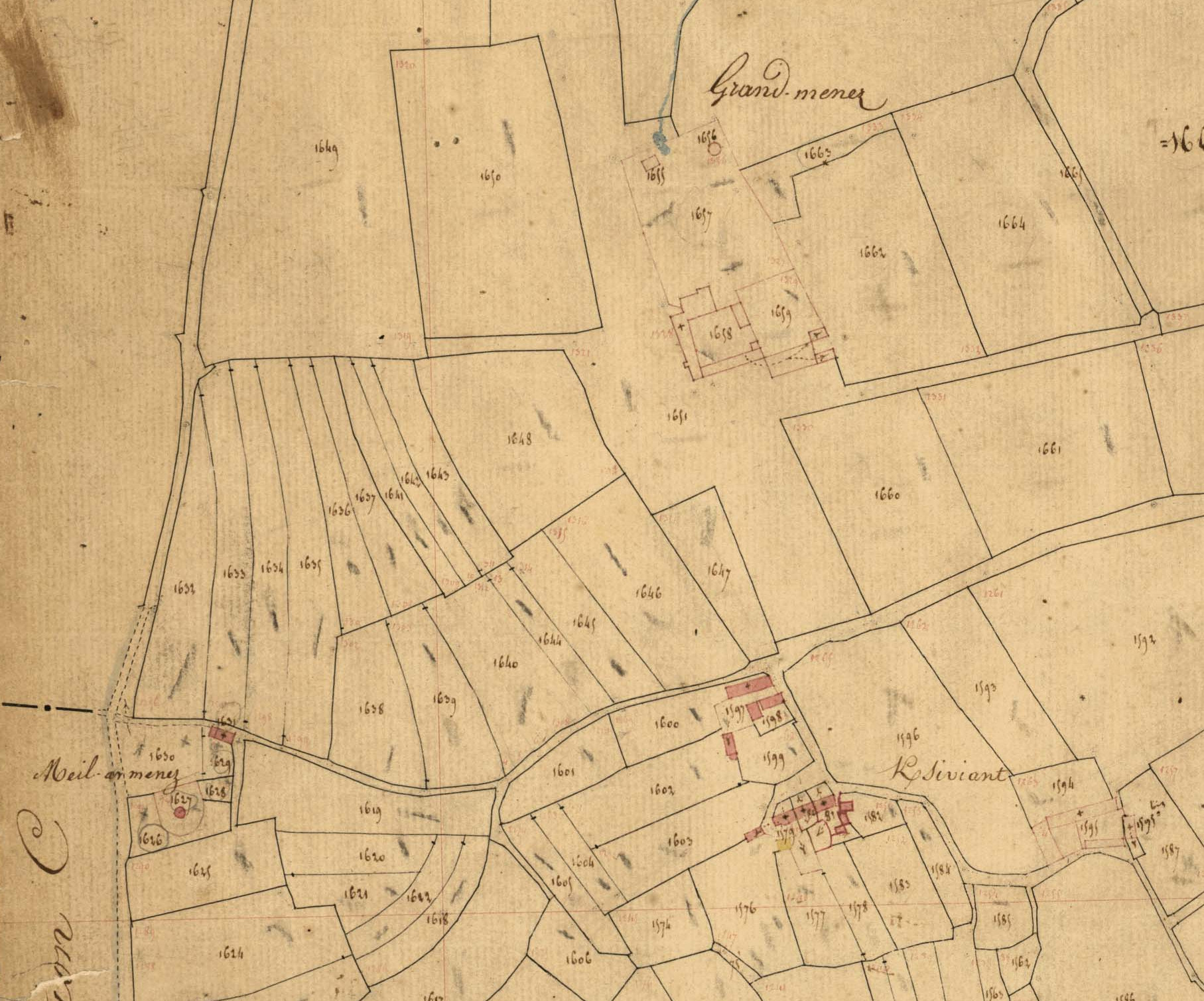 Meil ar Menez et manoir du Menez Bras, Section B 2 de Sainte-Brigitte du cadastre ancien de la commune d'Esquibien, 1837.Immatriculation