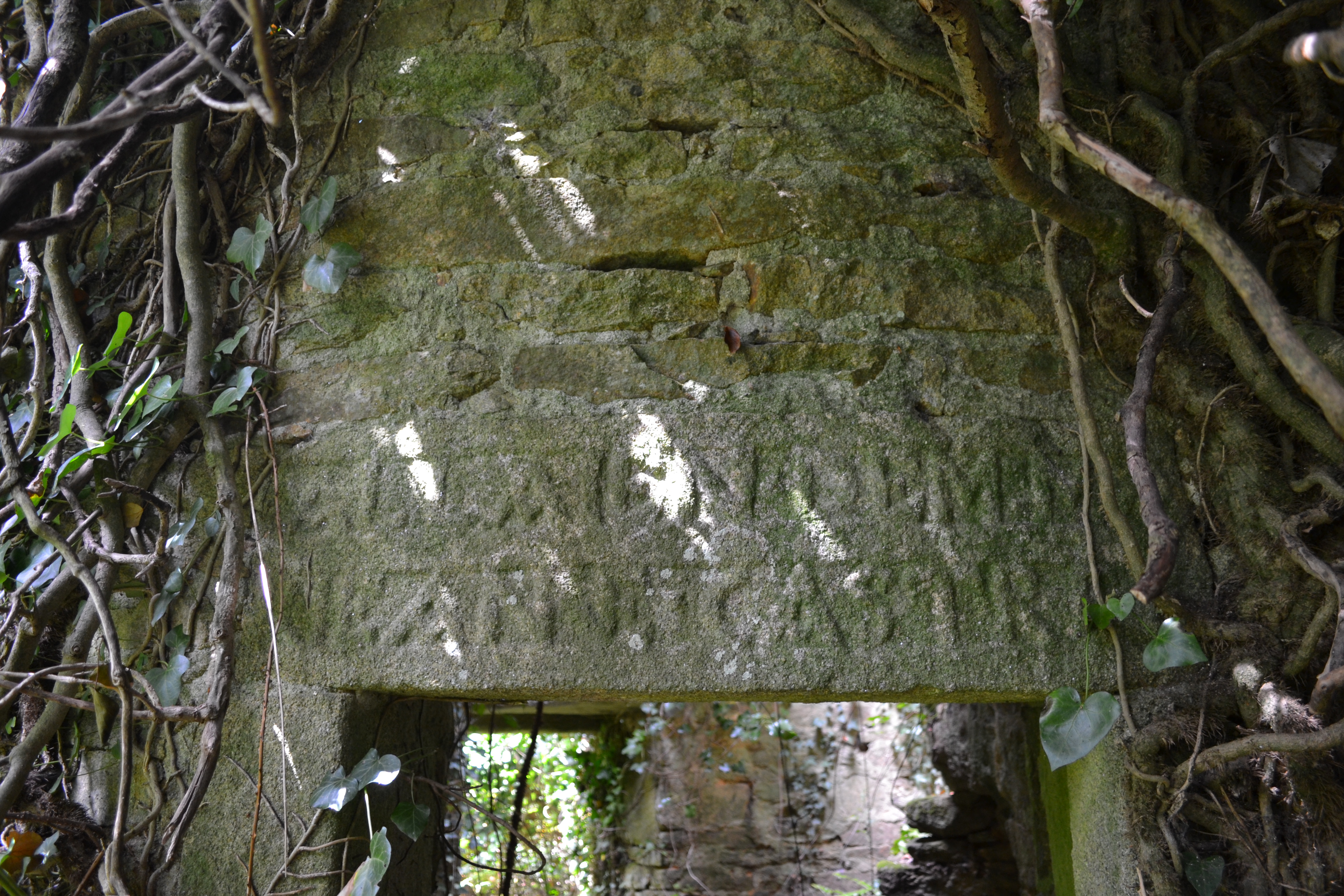 Moulin à vent de Trohonan. Porte sud, linteau et inscription : ALLAIEN DEM : MAR / IE CASTREC.Immatriculation