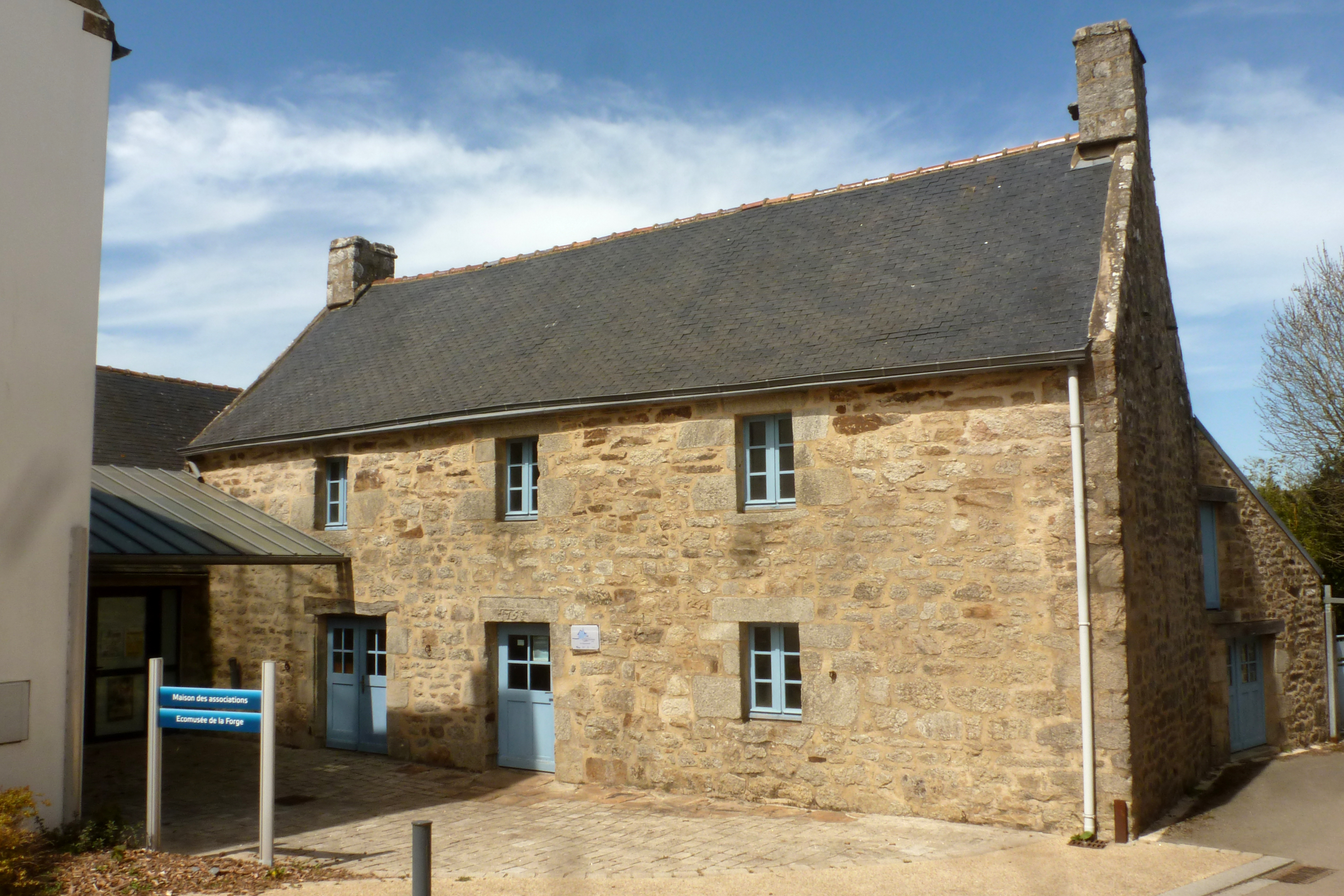 Bourg, maison 1, actuellement utilisée comme forge pédagogique. Elévation antérieure du logis daté 1758.Immatriculation