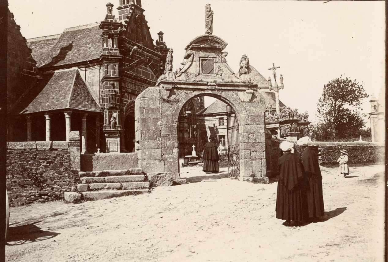Guimilliau (29) : deux femmes, devant l'entrée de l'enclos paroissial, portent un petit châle, une jupe et une coiffe du Haut-Léon. En arrière-plan, le calvaire et le porche de l'église.Immatriculation