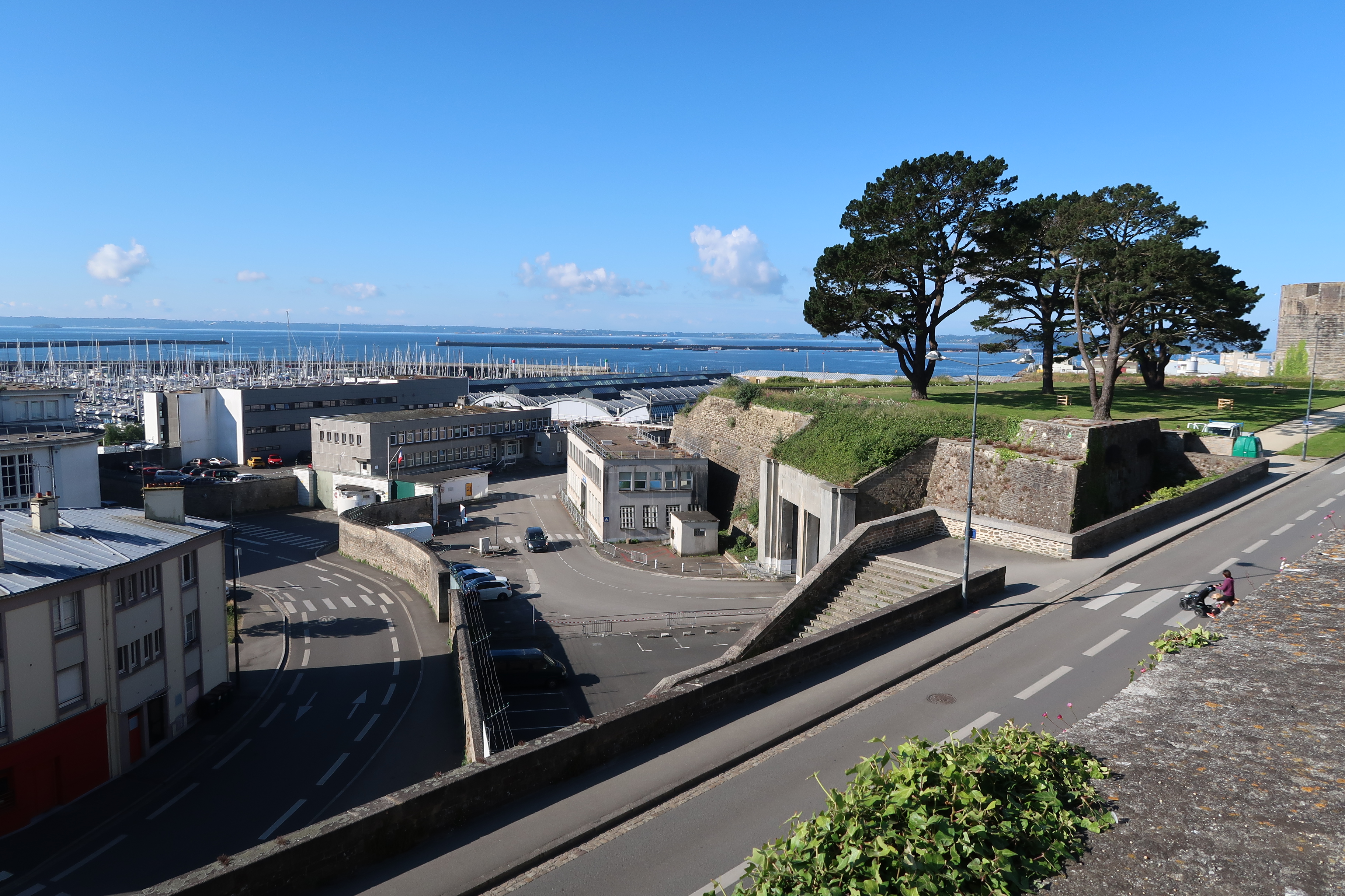 Le port depuis le cours Dajot : rampes et escaliers d'accès, jardin public et point de vue, porte "Surcouf" de la base navale, port de plaisanceImmatriculation