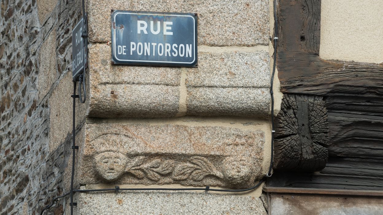Détail de la pierre sculptée du mur soutenant l'encorbellement en pan de bois.Immatriculation