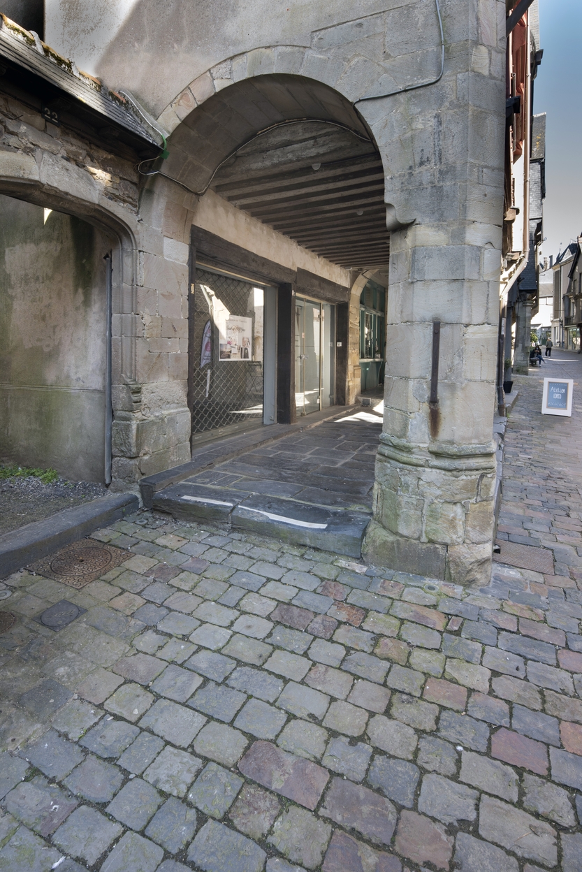 Vue rapprochée de l'arche et du porche de l'édifice en pan de bois.Immatriculation