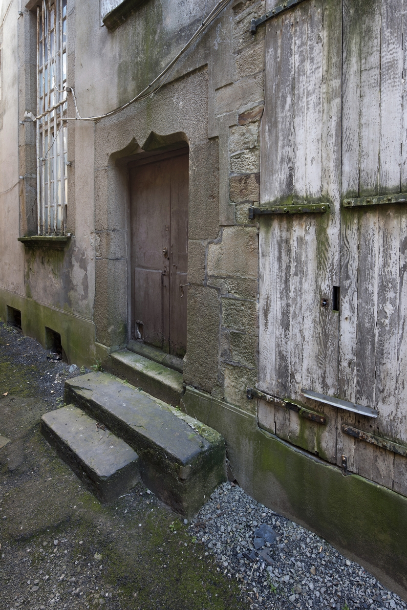 Sur sa façade ouest, porte de l'édifice en pan de bois.Immatriculation
