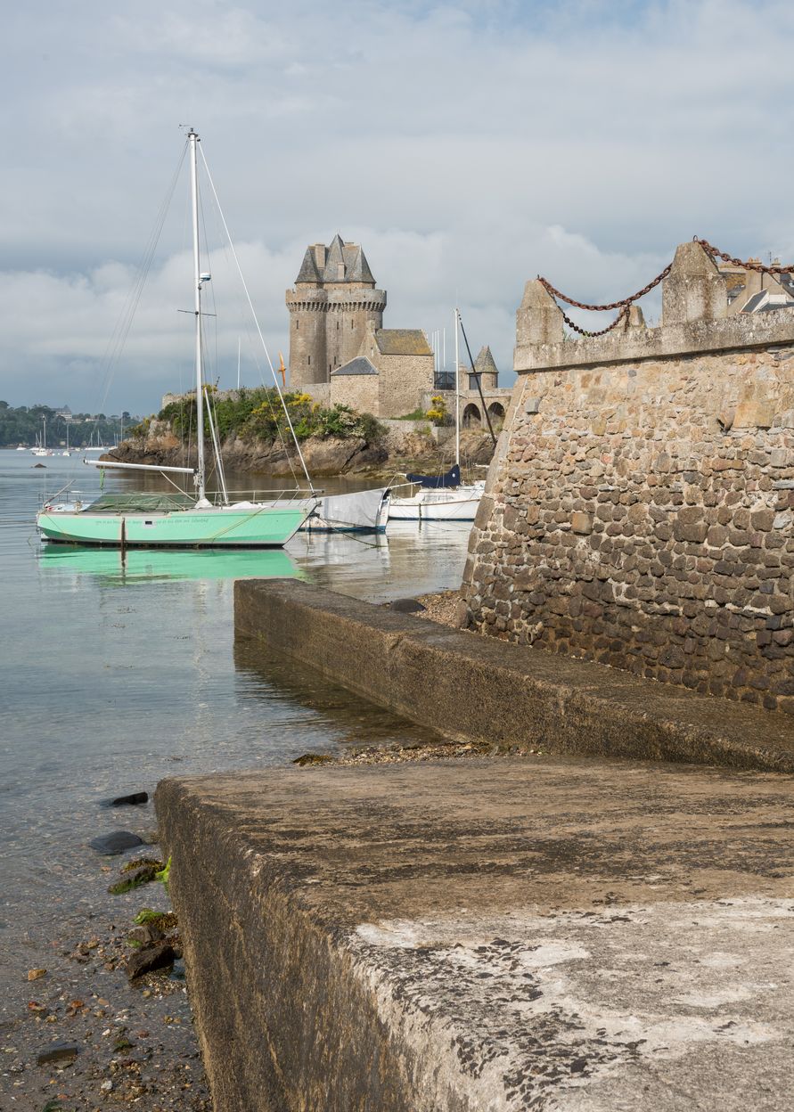 Vue générale depuis l'est-nord-est. Au premier plan, la petite cale de Solidor. Au mouillage dans l'anse de Solidor, navires de plaisanceImmatriculation