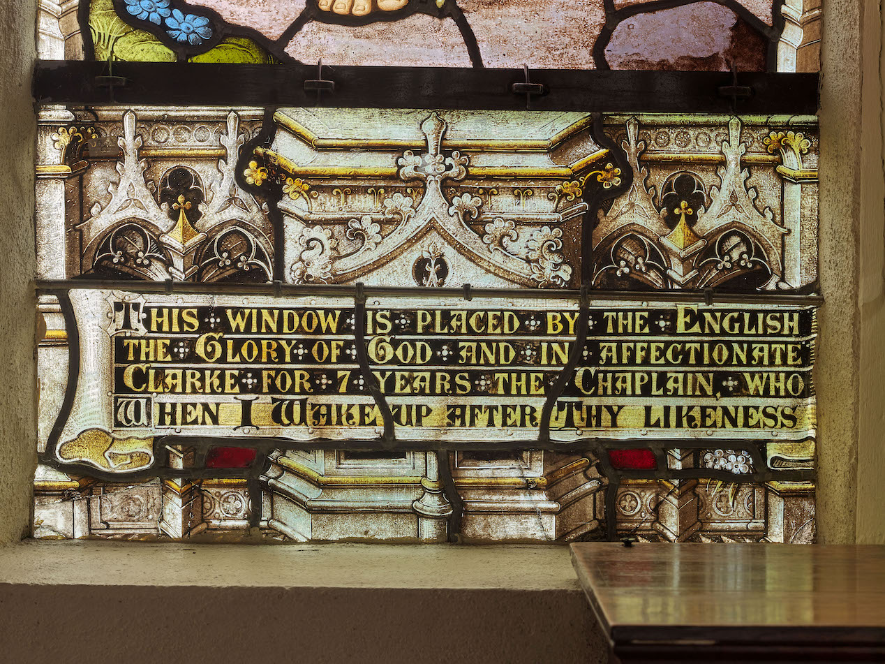 Baie n°15, verrière représentant le Christ bon pasteur et Christ à la lanterne, détail. A la mémoire de Percy Carmichael Clarke, aumônier, décédé en 1902' (2021)Immatriculation