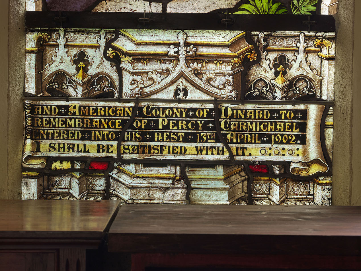 Baie n°15, verrière représentant le Christ bon pasteur et Christ à la lanterne, détail. A la mémoire de Percy Carmichael Clarke, aumônier, décédé en 1902' (2021)Immatriculation