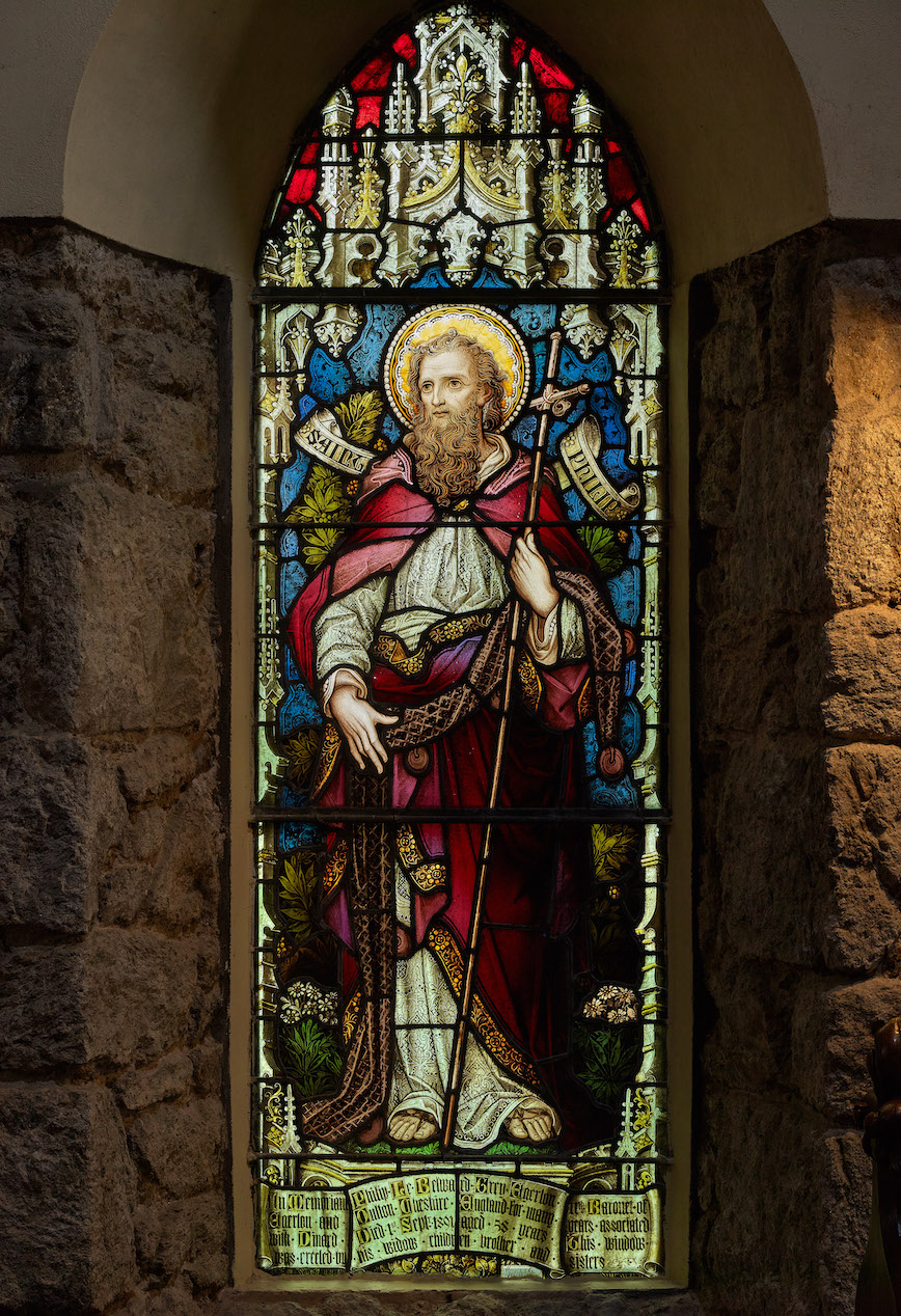 Baie n°4, verrière de saint Philippe. A la mémoire de Philip Le Belward Grey Egerton, décédé le 1 er septembre 1896, atelier Mayer and Co (2021)Immatriculation