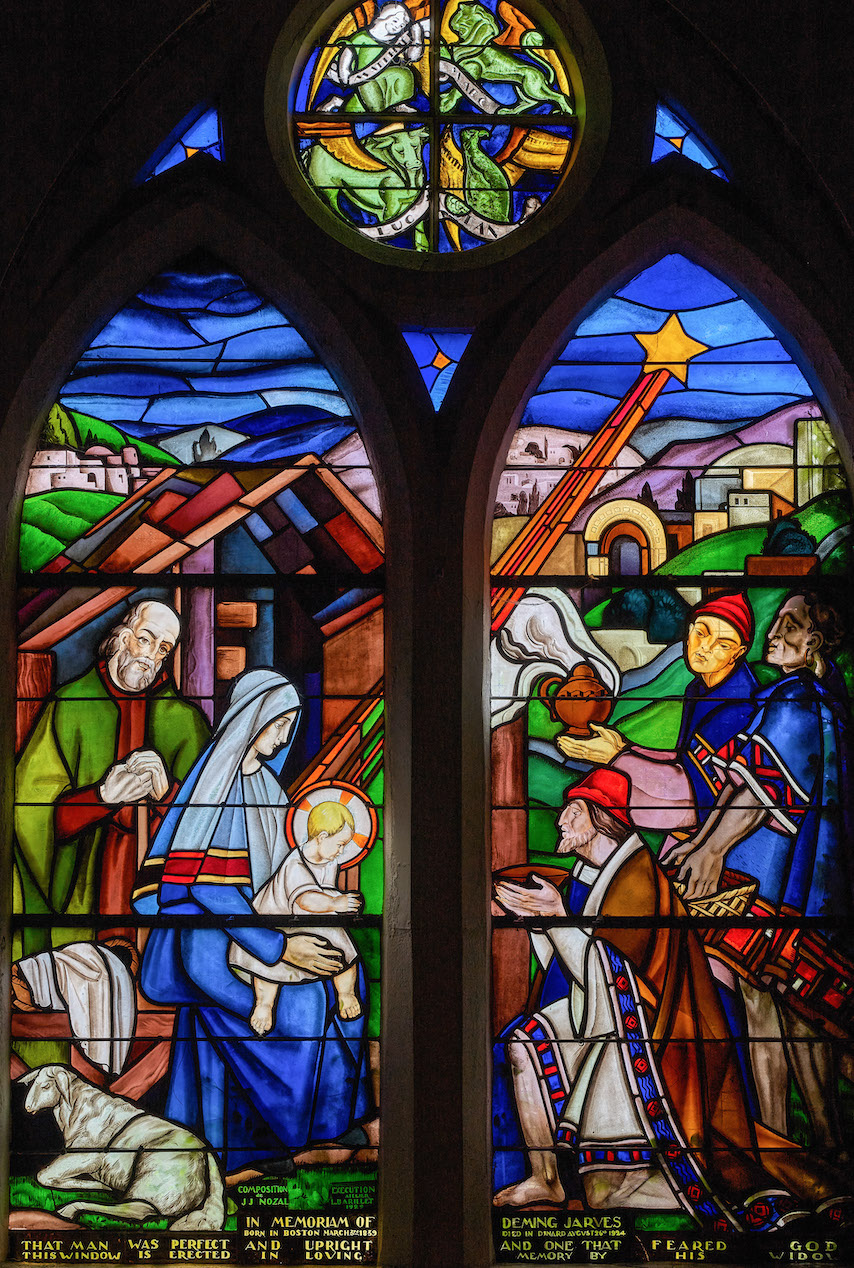 Verrière 4 'Les rois mages offrent leurs présents à Jésus après avoir été guidés vers lui par l'étoile', vue générale. Atelier de Louis Barillet en 1929 (2021)Immatriculation