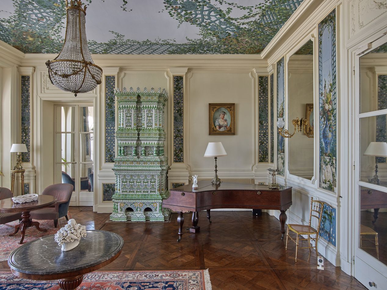 Vue d'ensemble: poêle en céramique, décor de papiers peintsImmatriculation