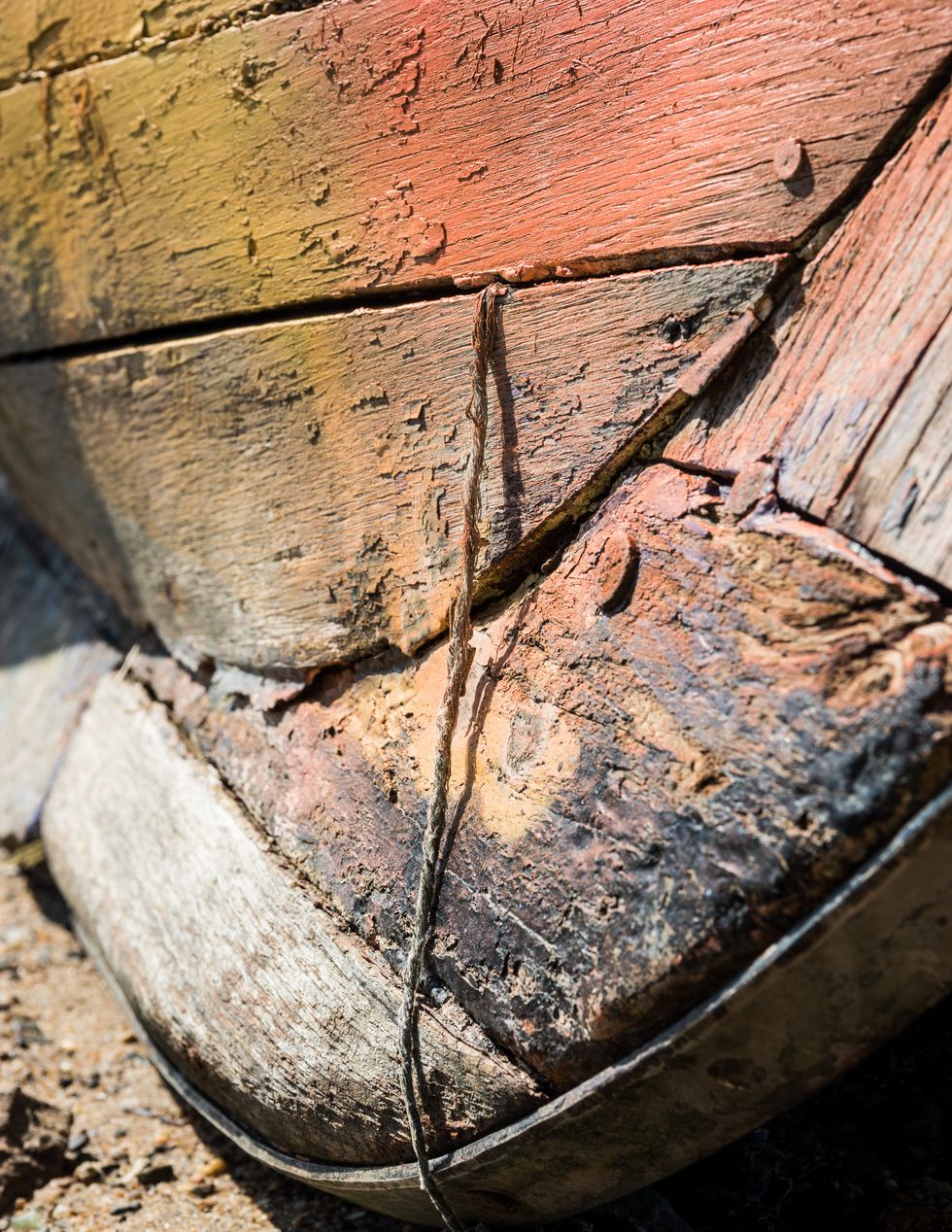 Le Koulmic, bateau en bois bordé sur membrures, vue de détail du brionImmatriculation