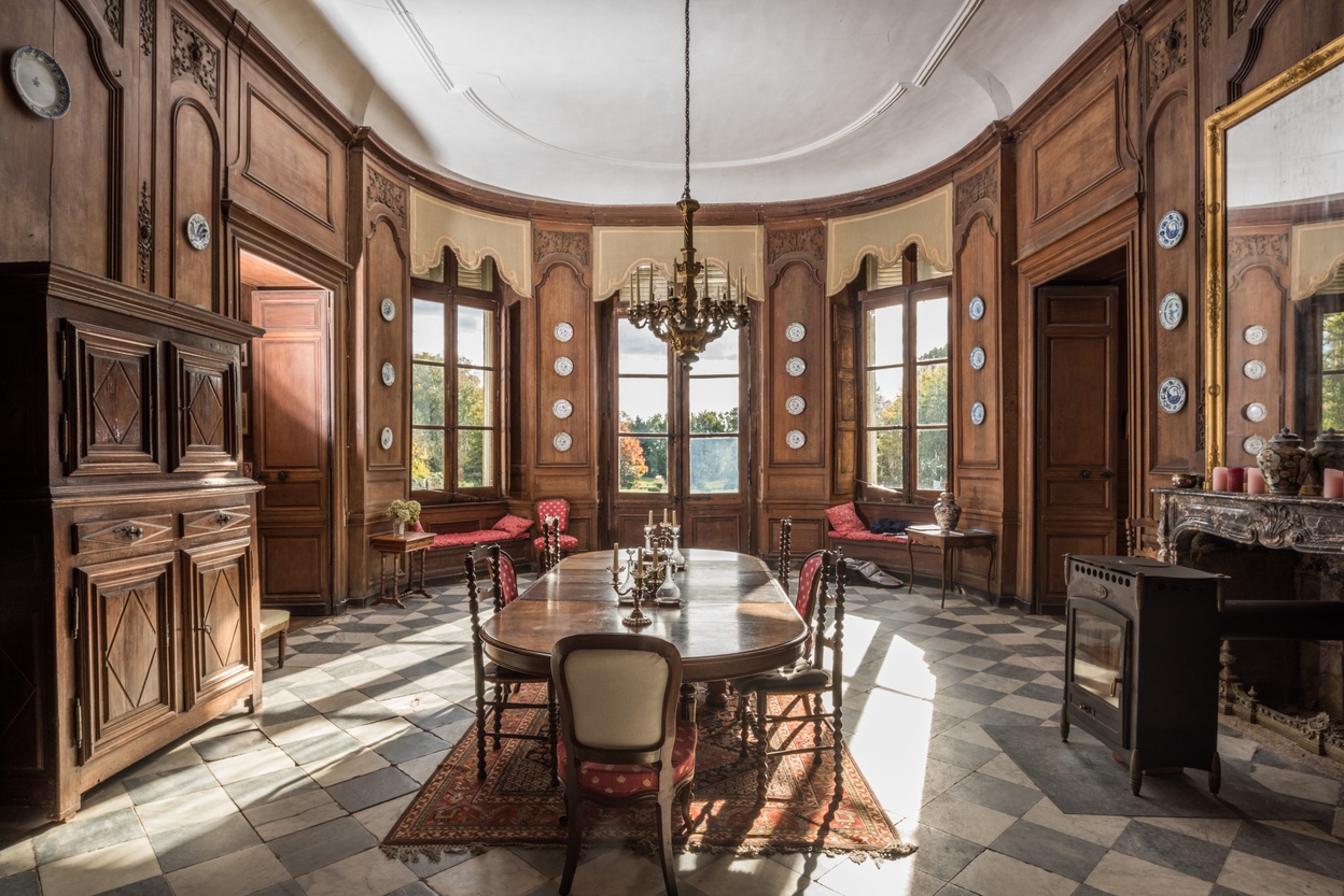 La salle à manger éclairée d'une lumière méridionale, avec armoire malouine, trumeau de glace, boiseries de chêne naturel et dallage de marbreImmatriculation