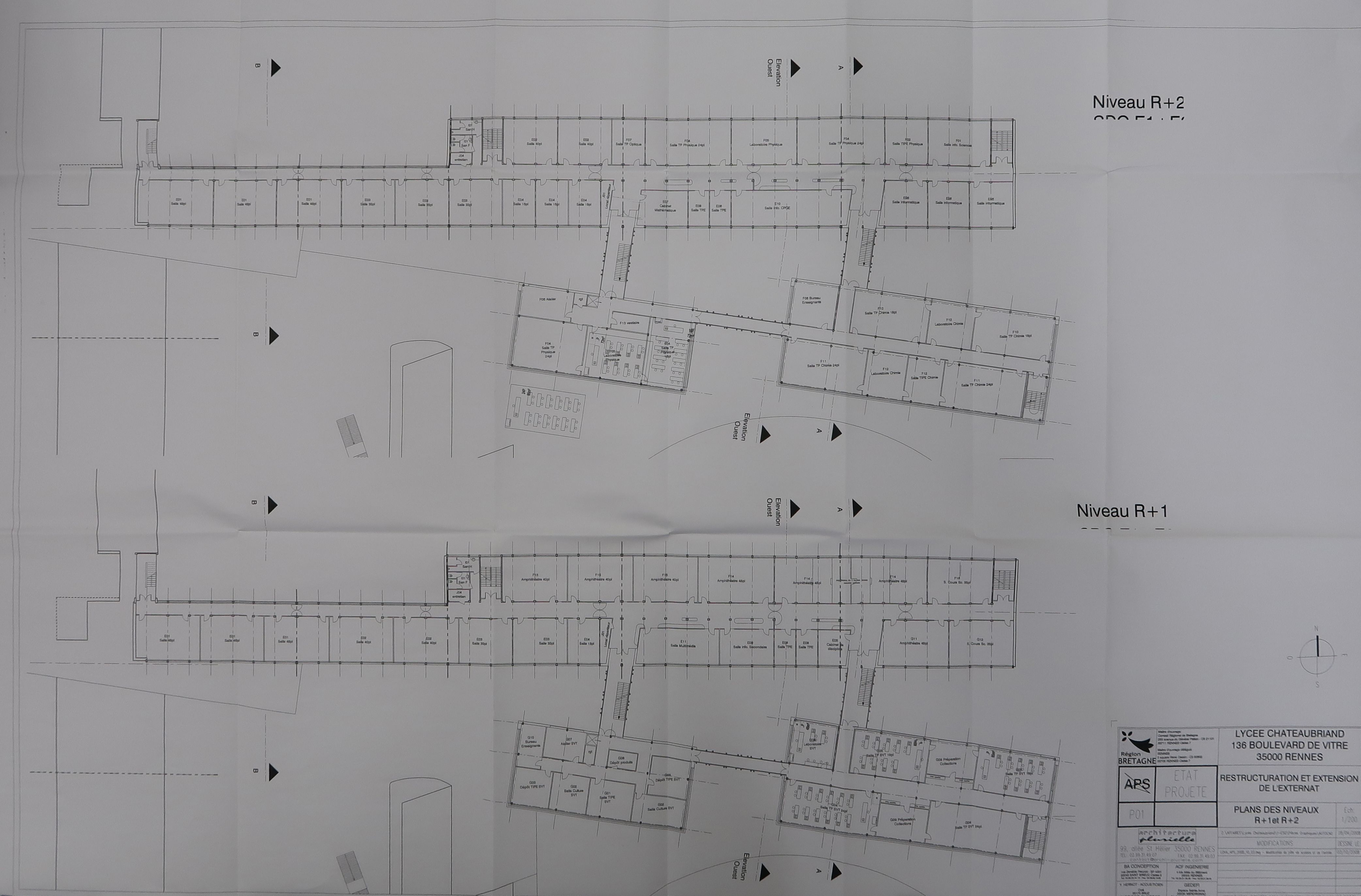Restructuration et extension de l'externat : plan des premier et deuxième étages . Thierry Soquet (Architecture plurielle), architecte, plans du 3/10/2008.Immatriculation